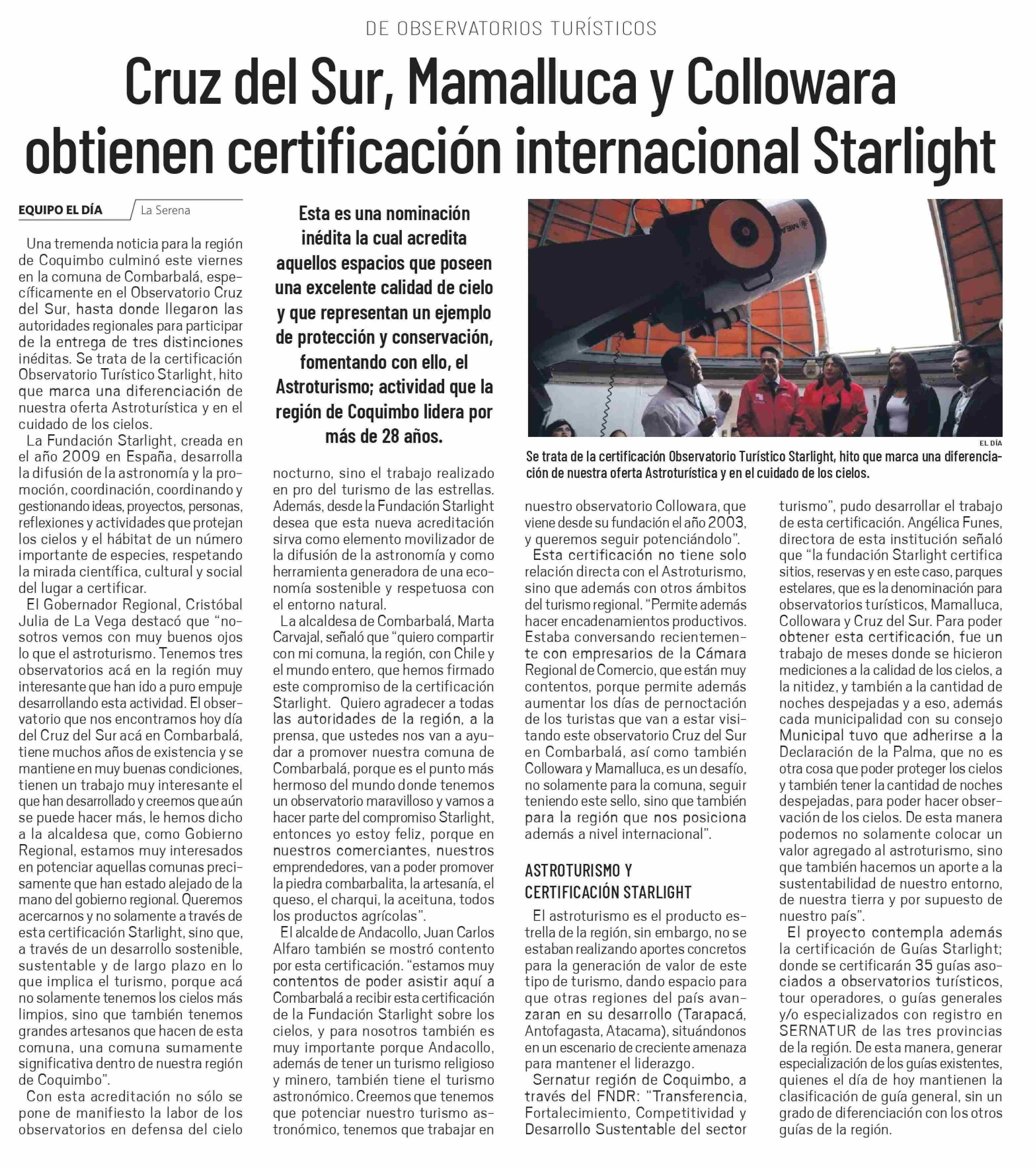 Cruz del Sur, Mamalluca y Collowara obtienen certificación internacional Starlight 26-05-2025 El Día |