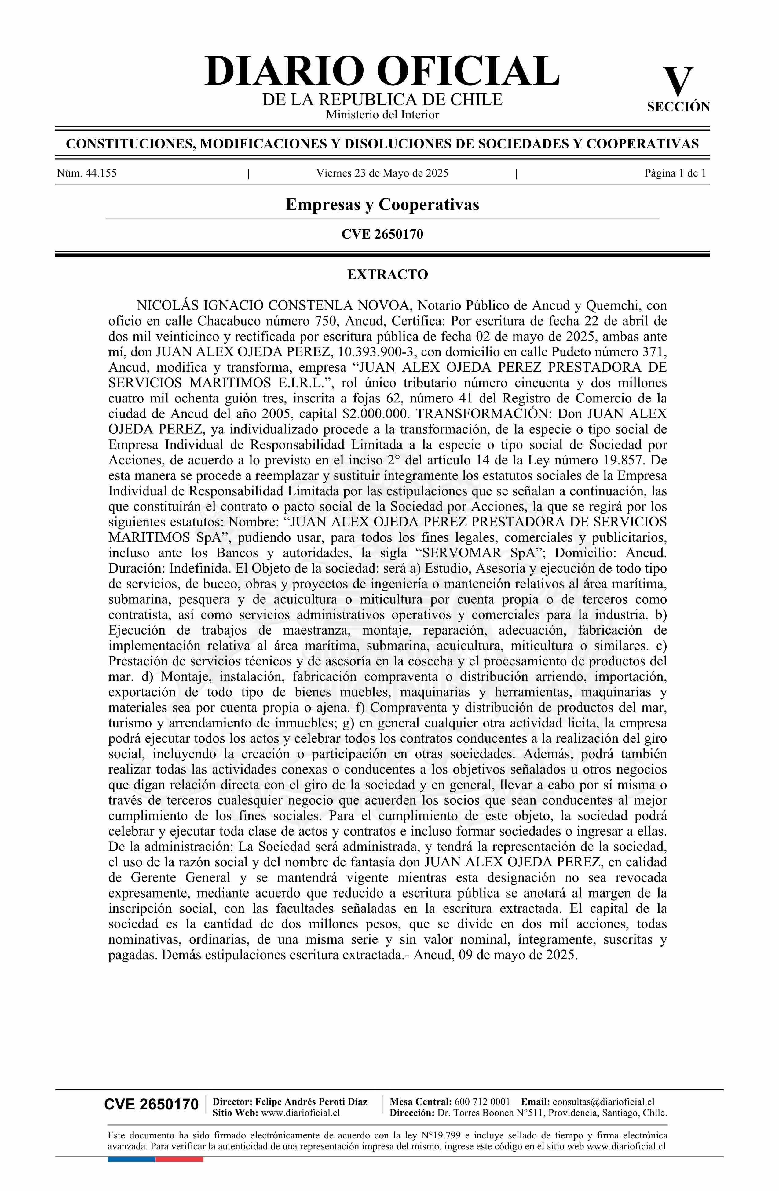 JUAN ALEX OJEDA PEREZ PRESTADORA DE SERVICIOS MARITIMOS E.I.R.L. 52.004.080-3 23-05-2025 Diario Oficial Edición Electrónica |