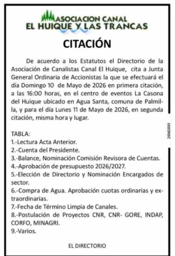 Título: AMASOCIACION CANAL EL HUIQUE Y LAS TRANCAS