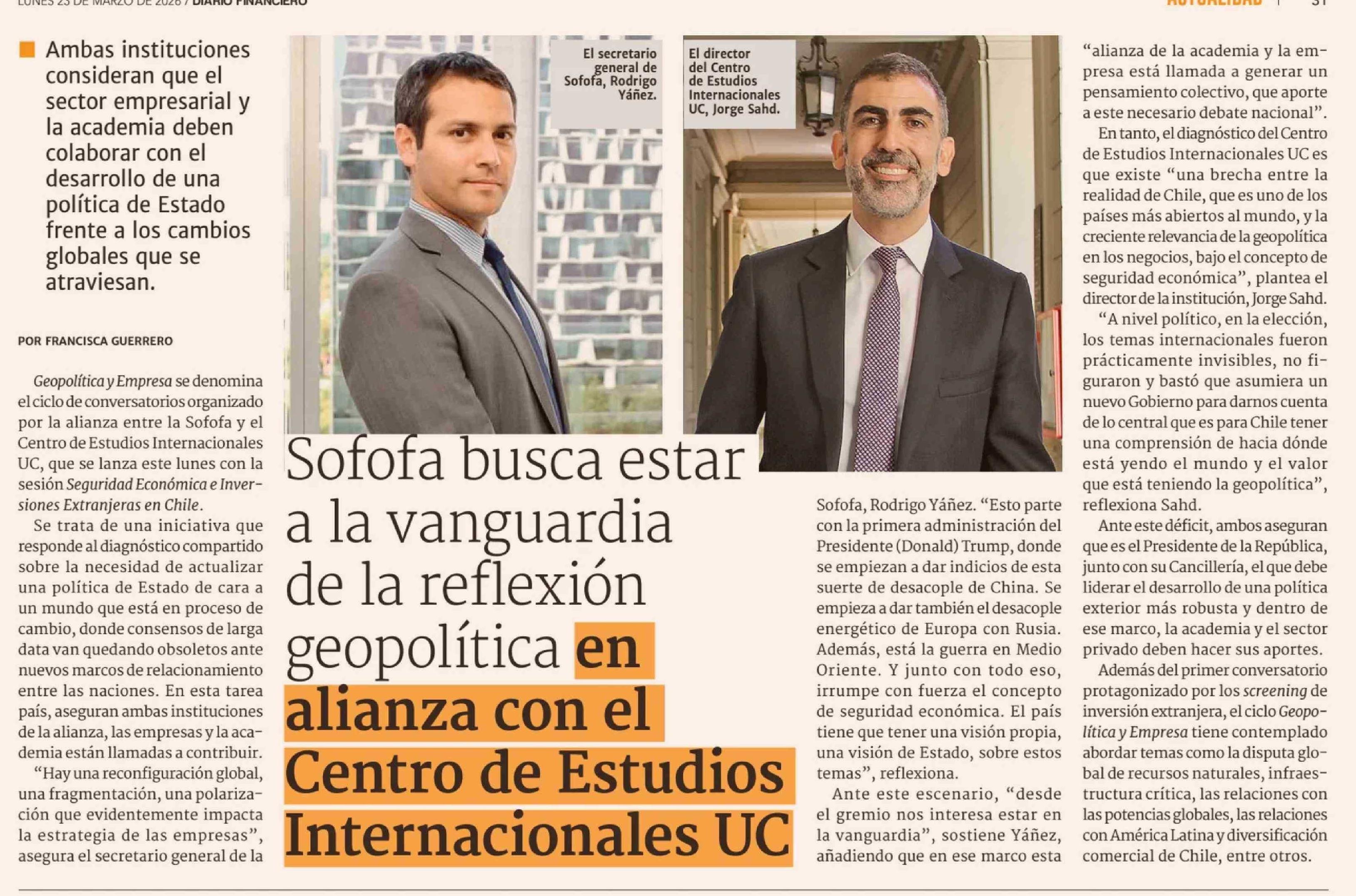 Sofofa busca estar a la vanguardia de la reflexión geopolítica en alianza con el Centro de Estudios Internacionales UC 23-03-2026 Diario Financiero |