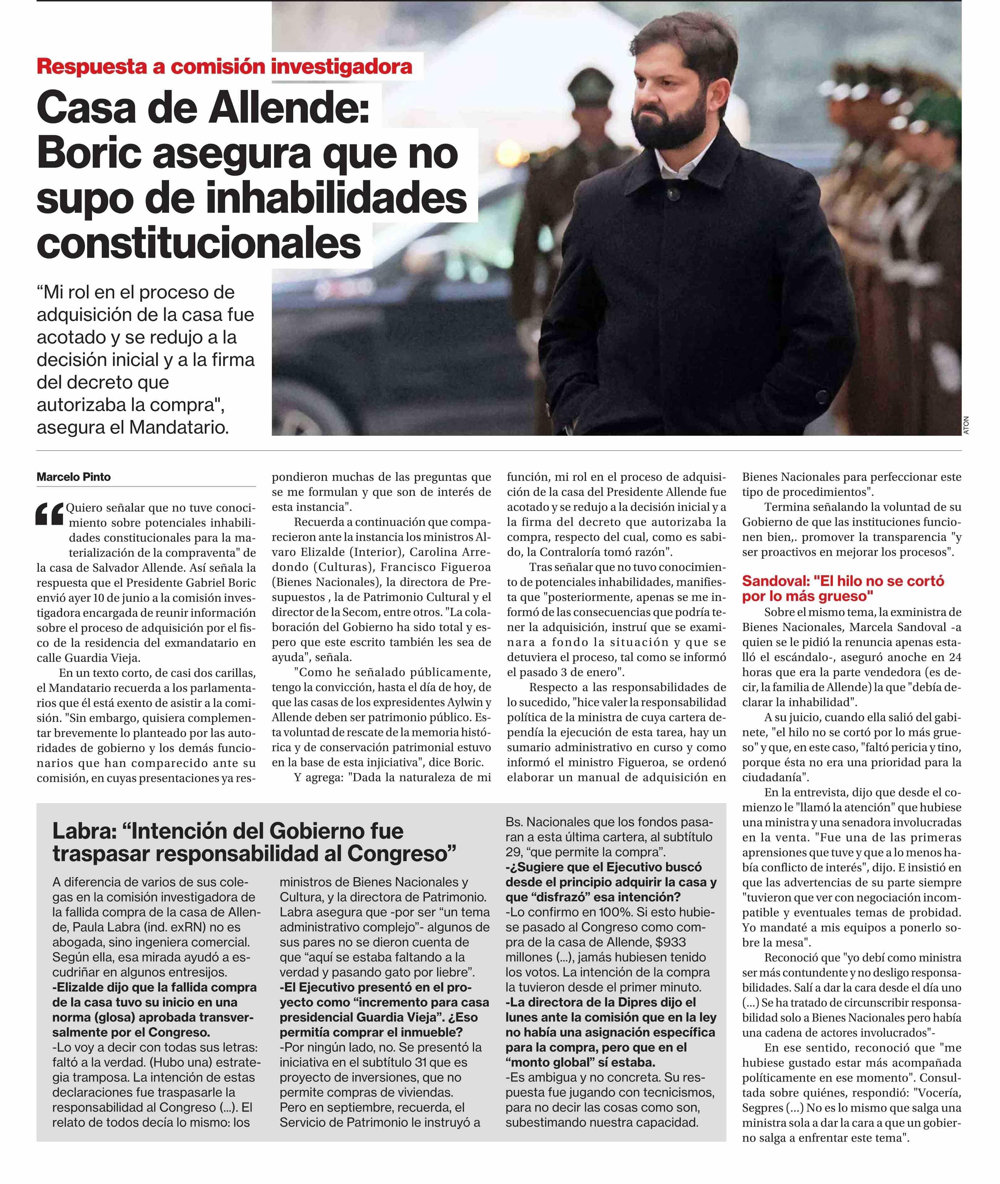 Casa de Allende: Boric asegura que no supo de inhabilidades constitucionales 11-06-2025 La Segunda |