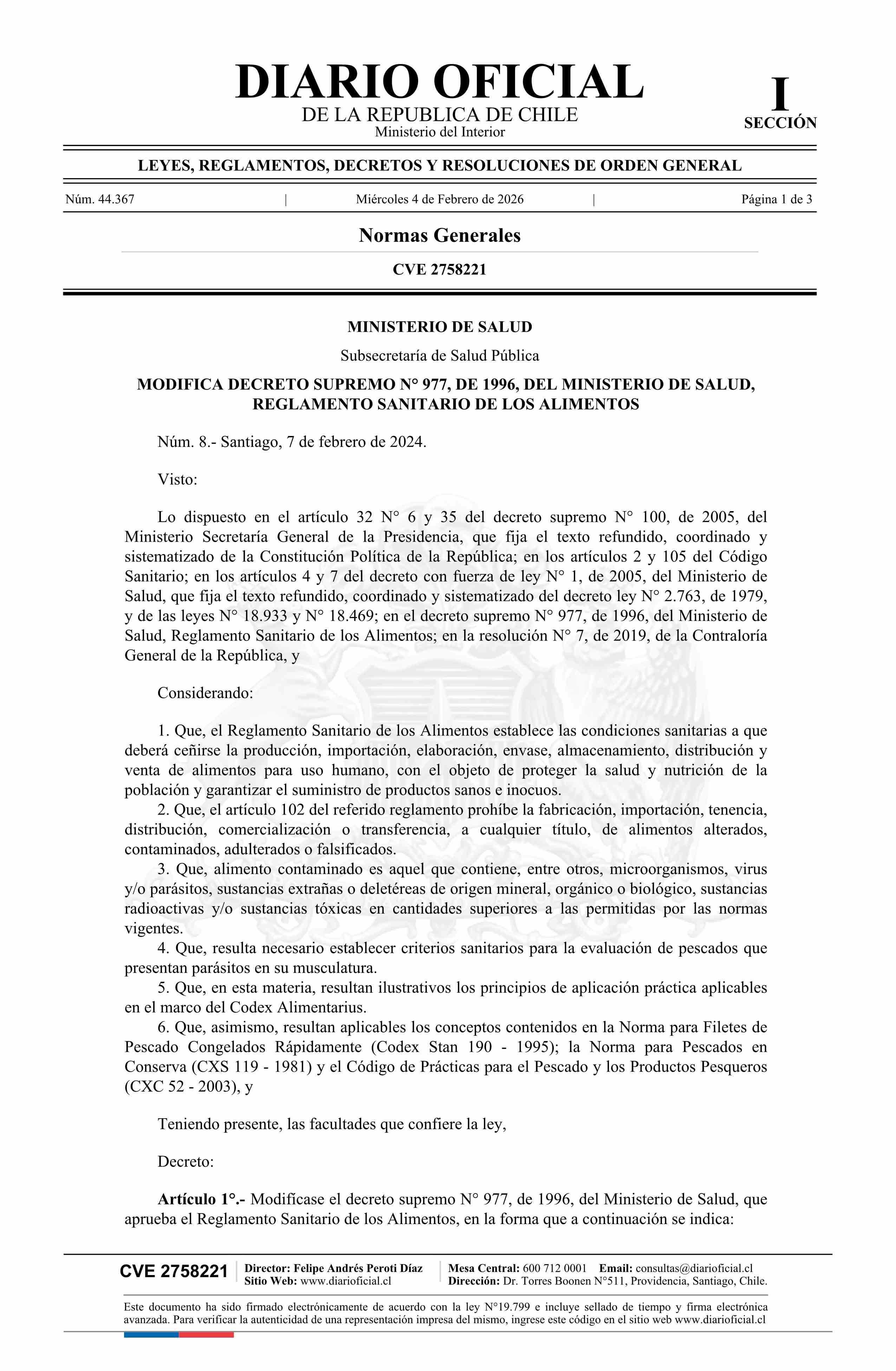 Título: Decreto número 8, de 2024.- Modifica decreto N° 77, de 1996, Reglamento Sanitario de los Alimentos