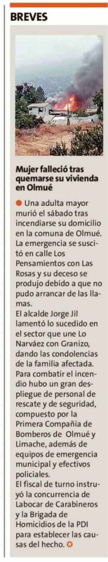 | Título: | Mujer falleció tras quemarse su vivienda en Olmué |