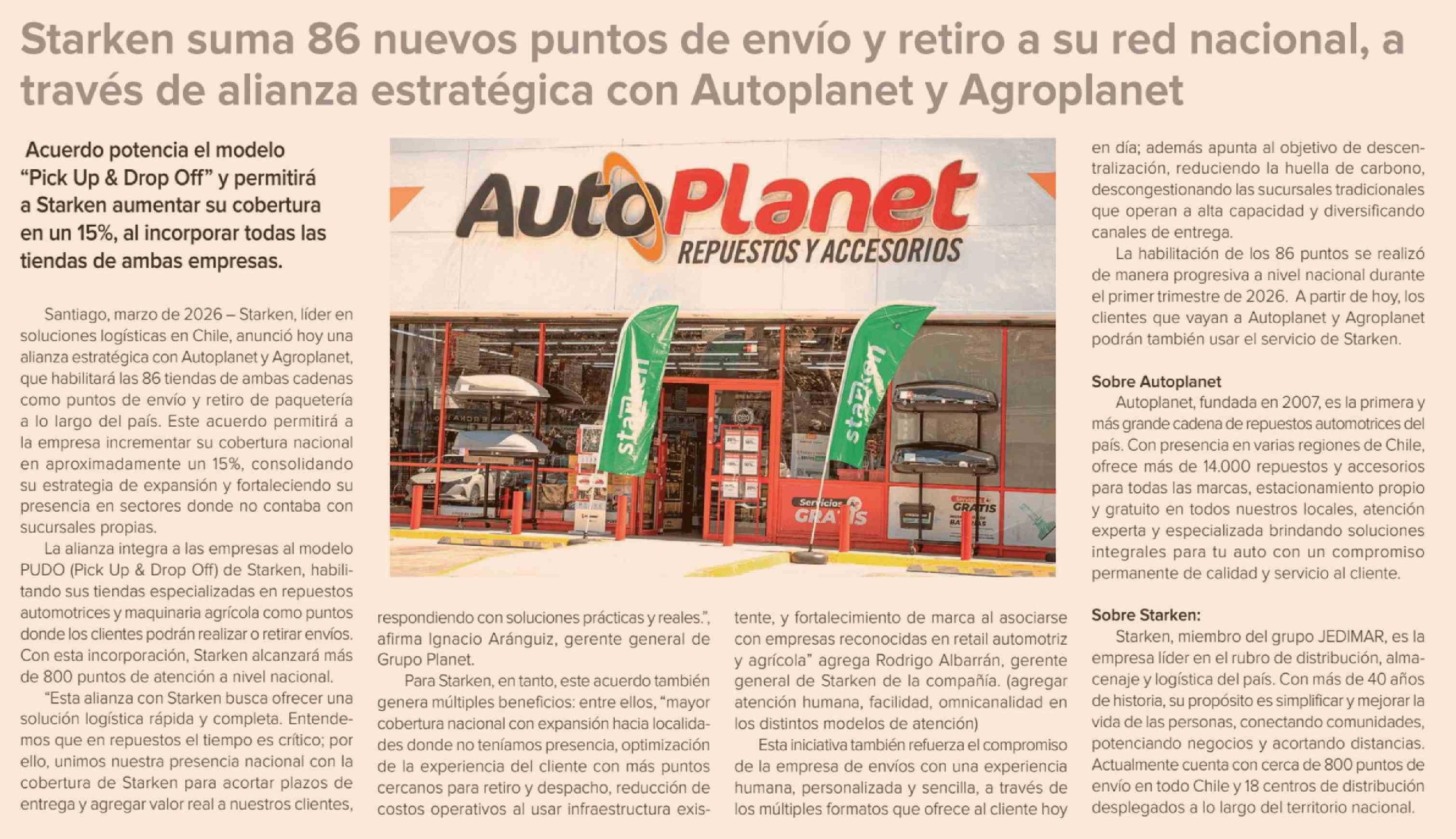Starken suma 86 nuevos puntos de envío y retiro a su red nacional, a través de alianza estratégica con Autoplanet y Agroplanet 26-03-2026 Diario Financiero |