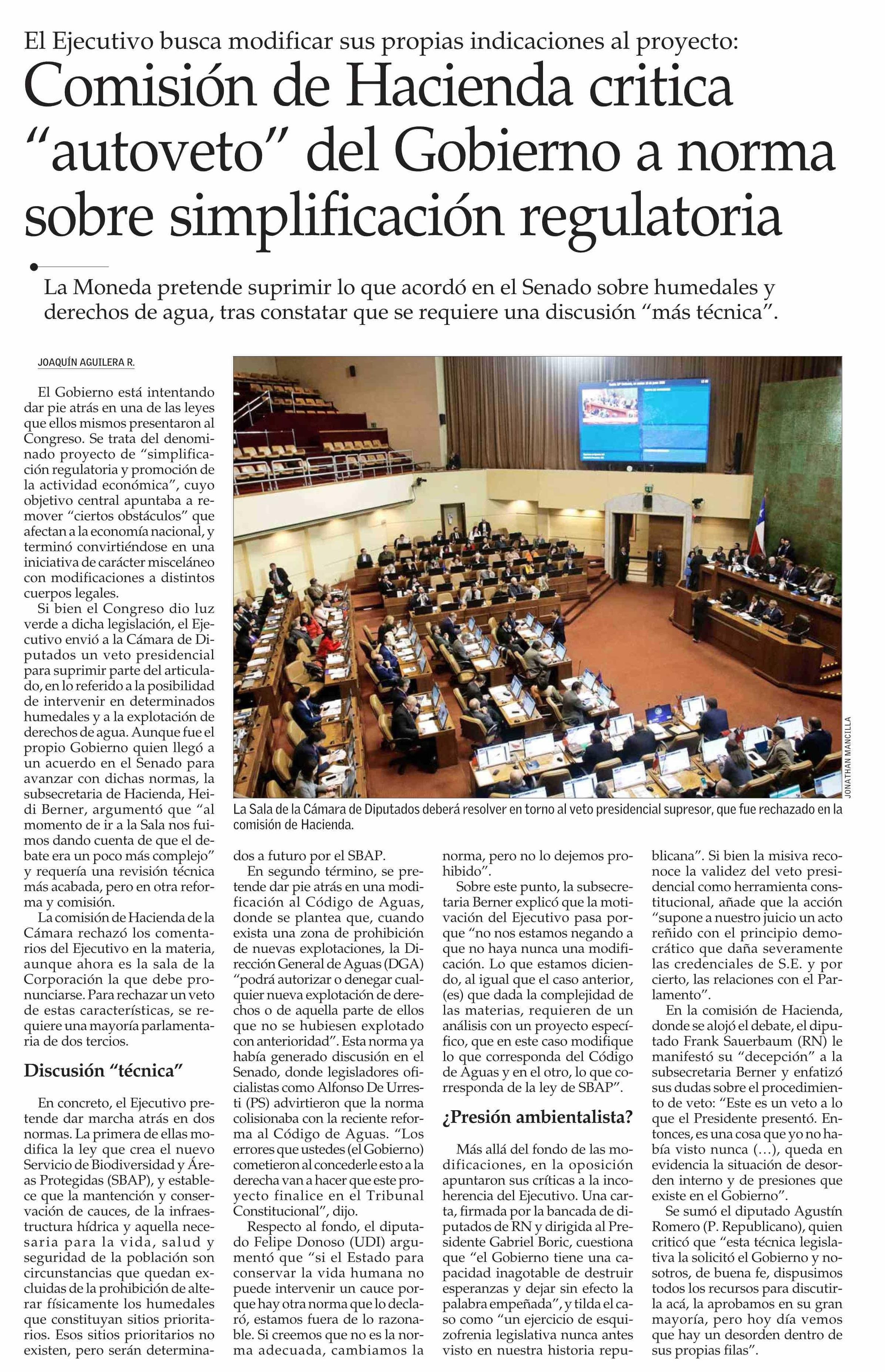 Comisión de Hacienda critica "autoveto" del Gobierno a norma sobre simplificación regulatoria 11-06-2025 El Mercurio |