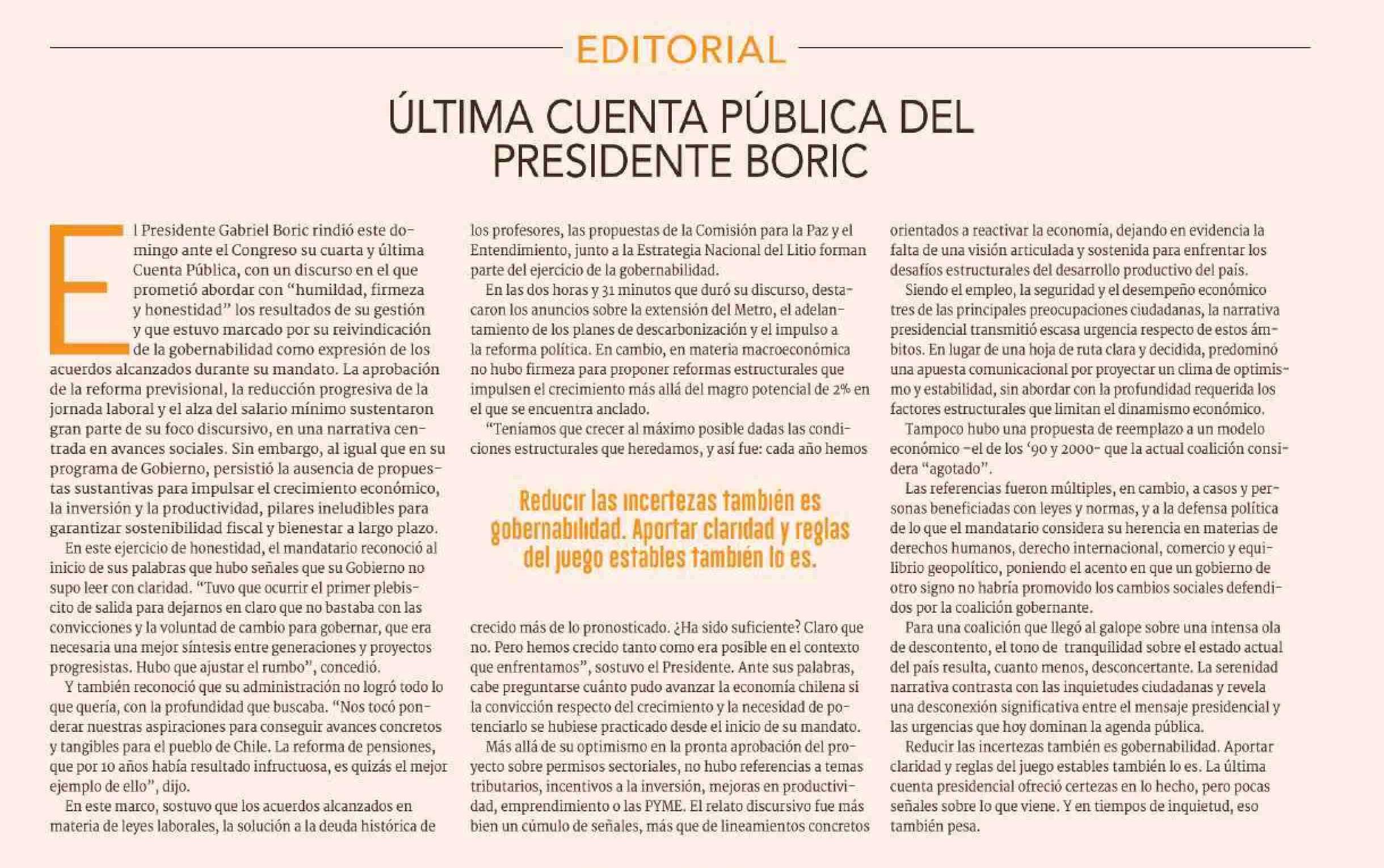 | Título: | EDITORIAL: ÚLTIMA CUENTA PÚBLICA DEL PRESIDENTE BORIC |