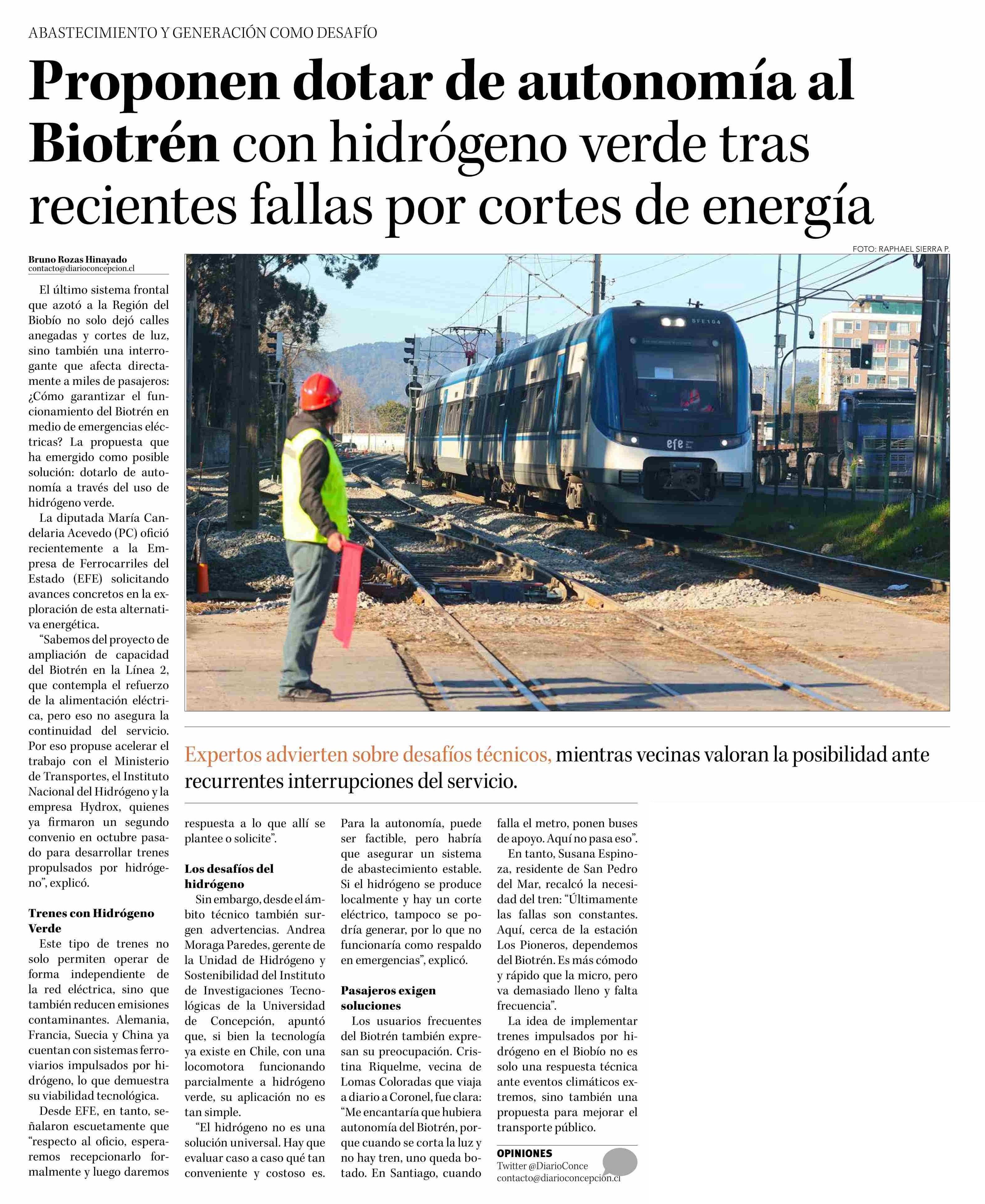 Proponen dotar de autonomía al Biotrén con hidrógeno verde tras recientes fallas por cortes de energía 20-06-2025 Diario Concepción |