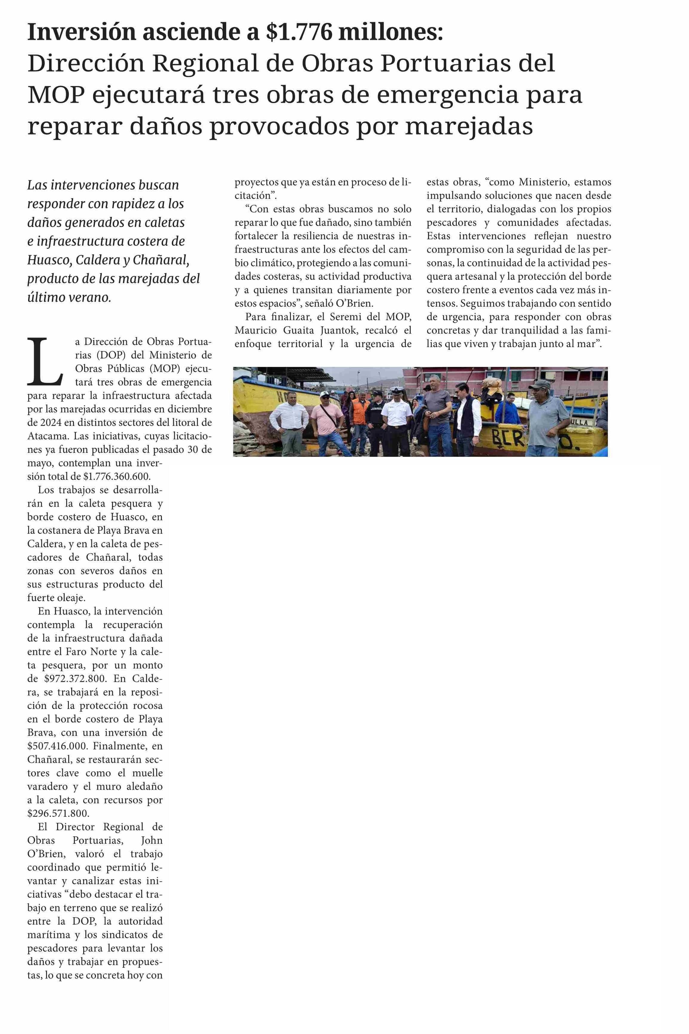 Inversión asciende a $1.776 millones: Dirección Regional de Obras Portuarias del MOP ejecutará tres obras de emergencia para reparar daños provocados por marejadas 06-06-2025 Diario Chañarcillo |