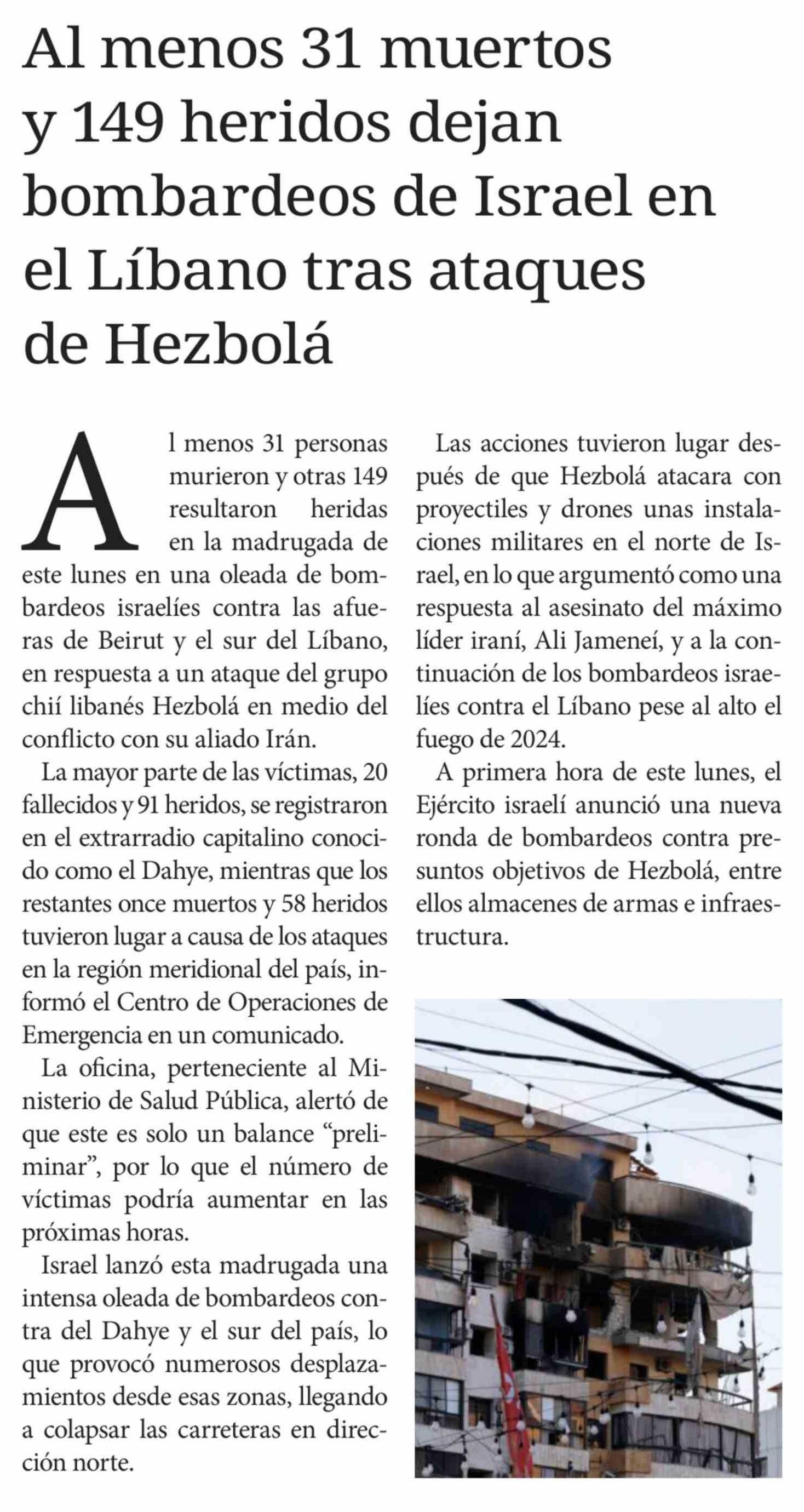 | Título: | Al menos 31 muertos y 149 heridos dejan bombardeos de Israel en el Líbano tras ataques de Hezbolá |