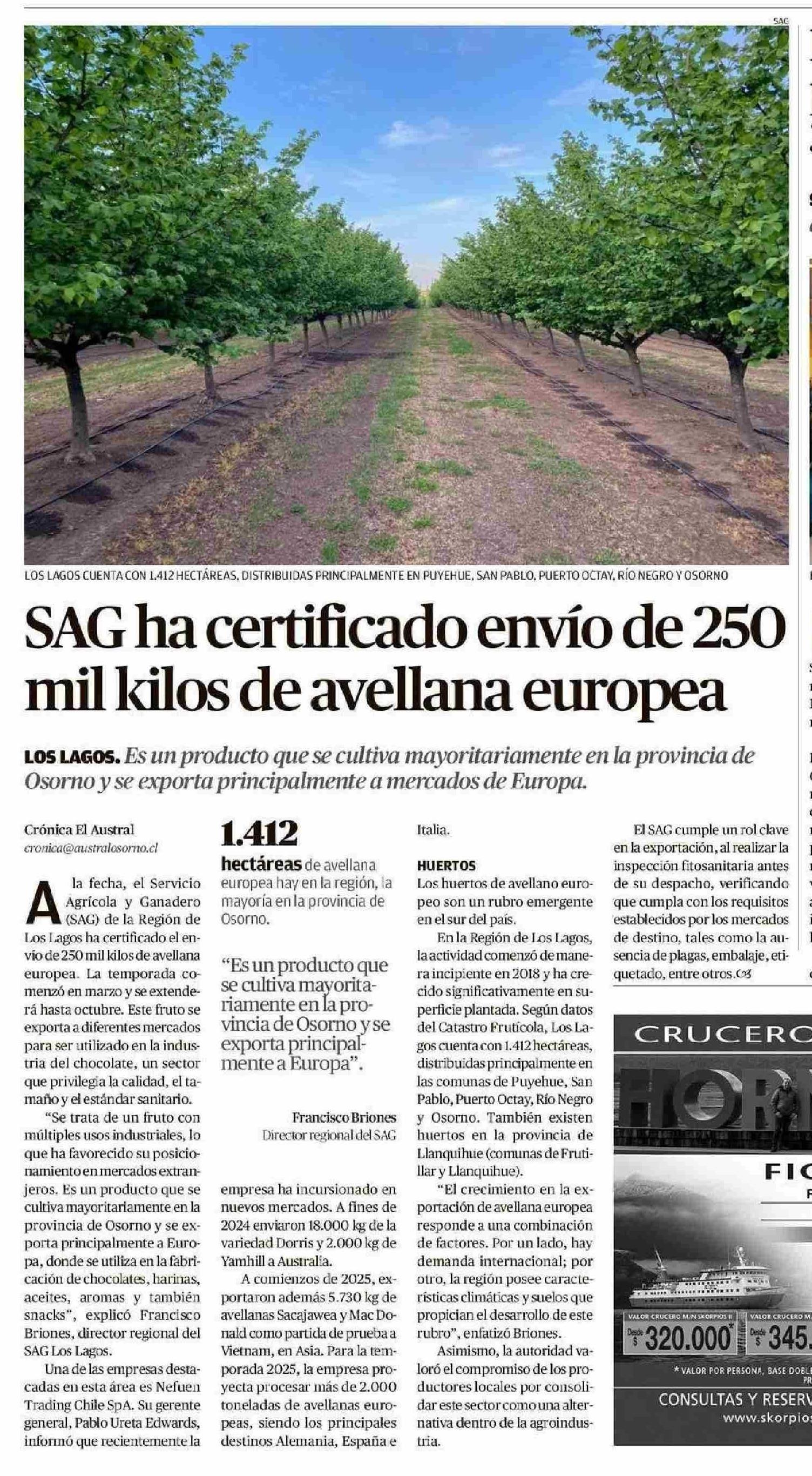 SAG ha certificado envío de 250 mil kilos de avellana europea 01-06-2025 El Austral de Osorno |