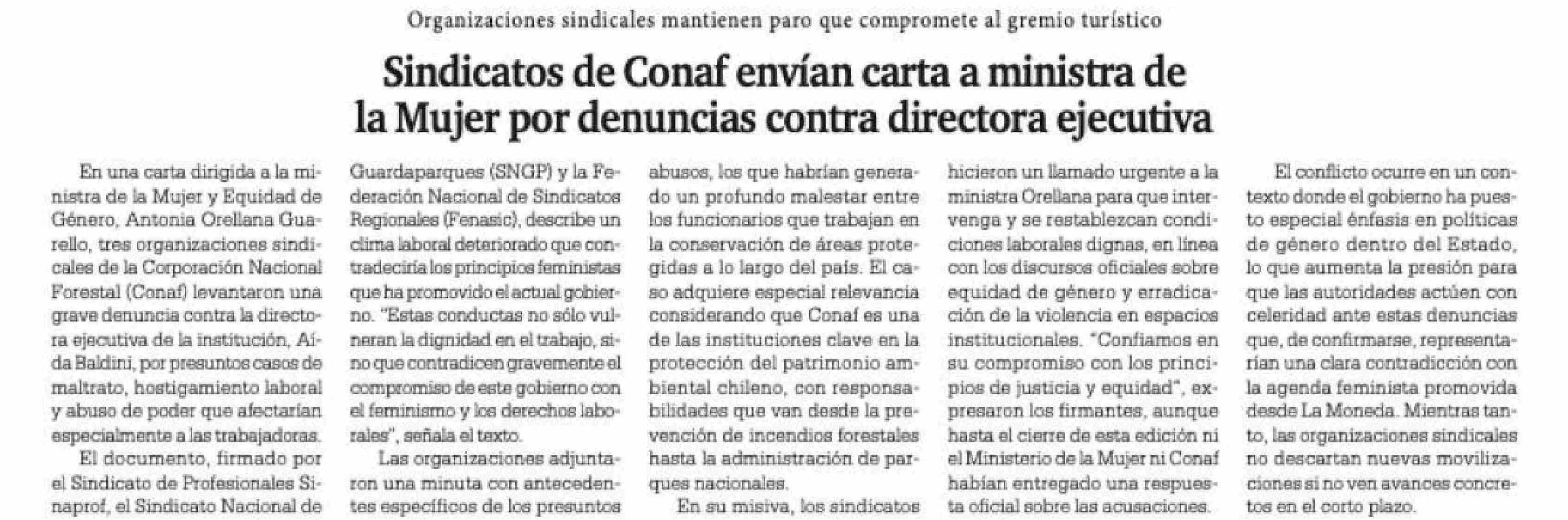 | Título: | Sindicatos de Conaf envían carta a ministra de la Mujer por denuncias contra directora ejecutiva |