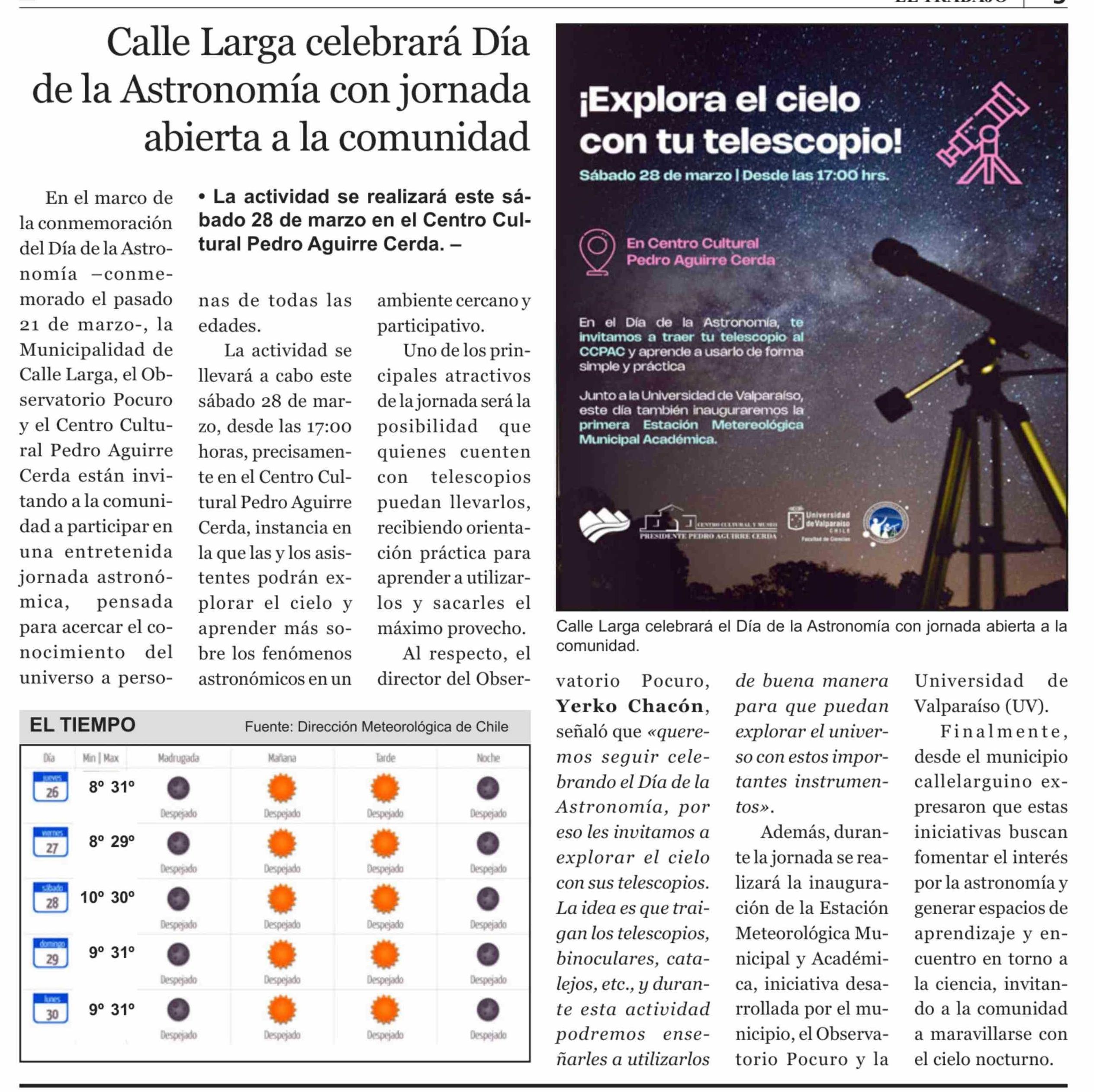 Título: Calle Larga celebrará Día de la Astronomía con jornada abierta a la comunidad