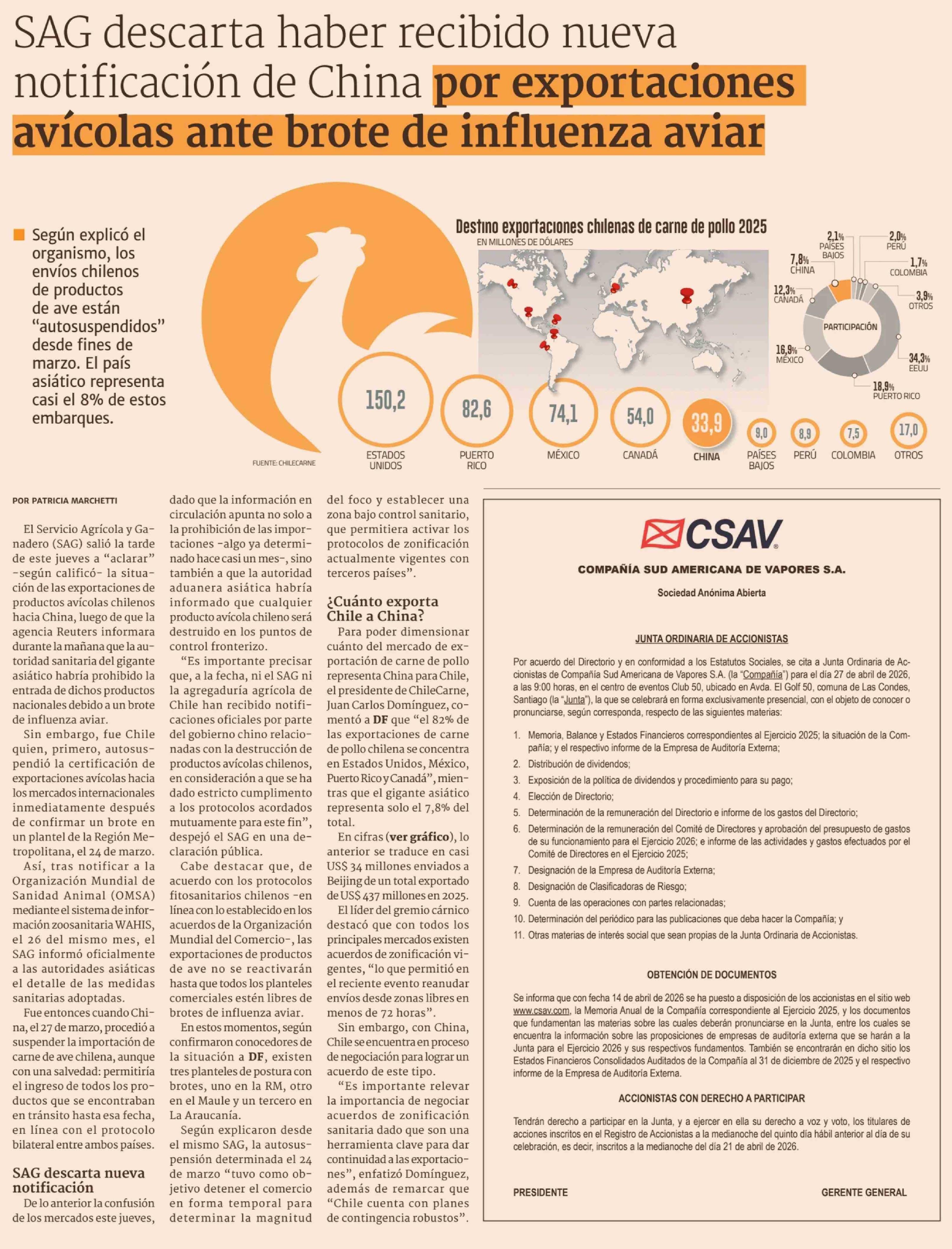 Título: SAG descarta haber recibido nueva notificación de China por exportaciones avícolas ante brote de influenza aviar