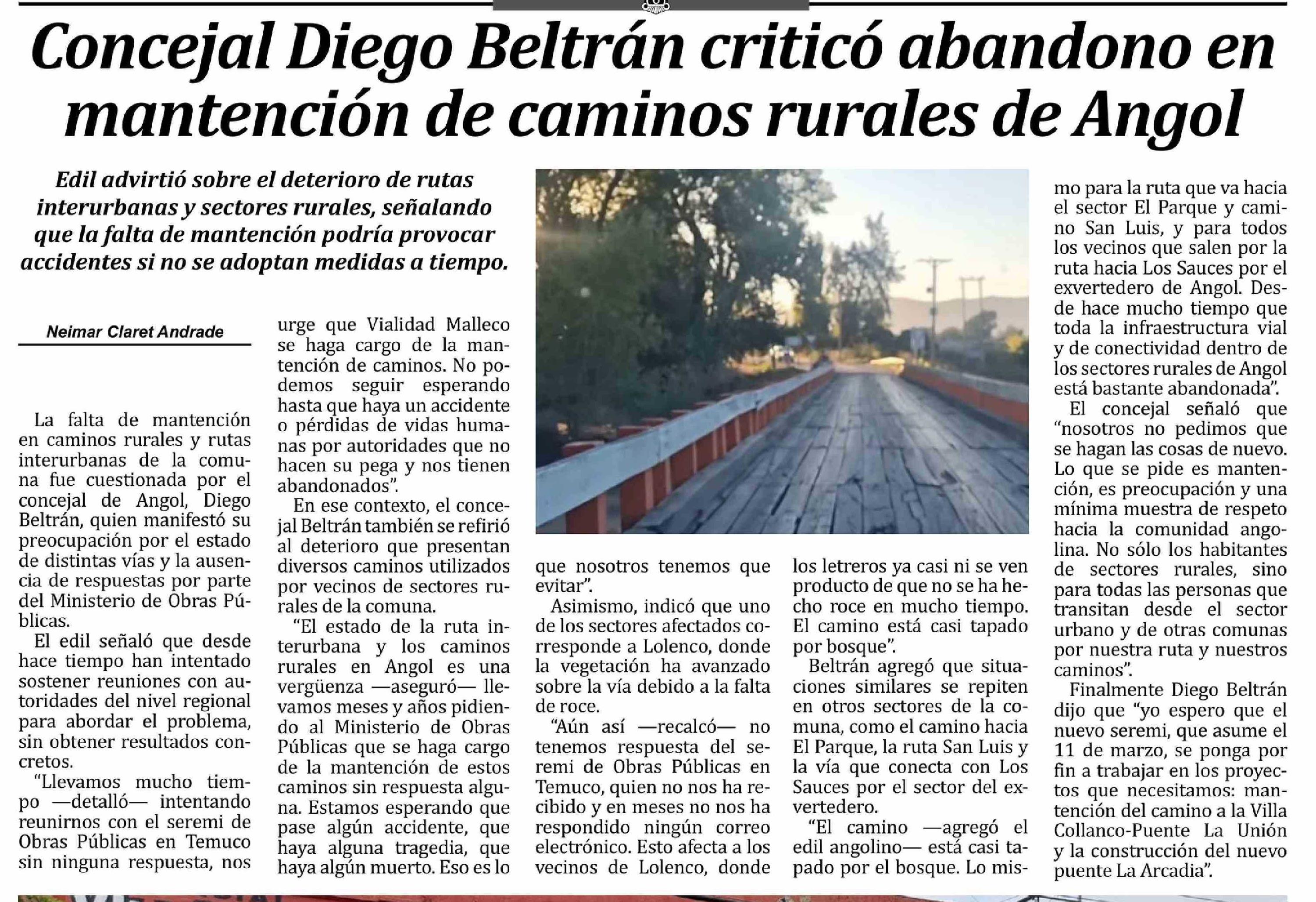 Título: Concejal Diego Beltrán criticó abandono en mantención de caminos rurales de Angol