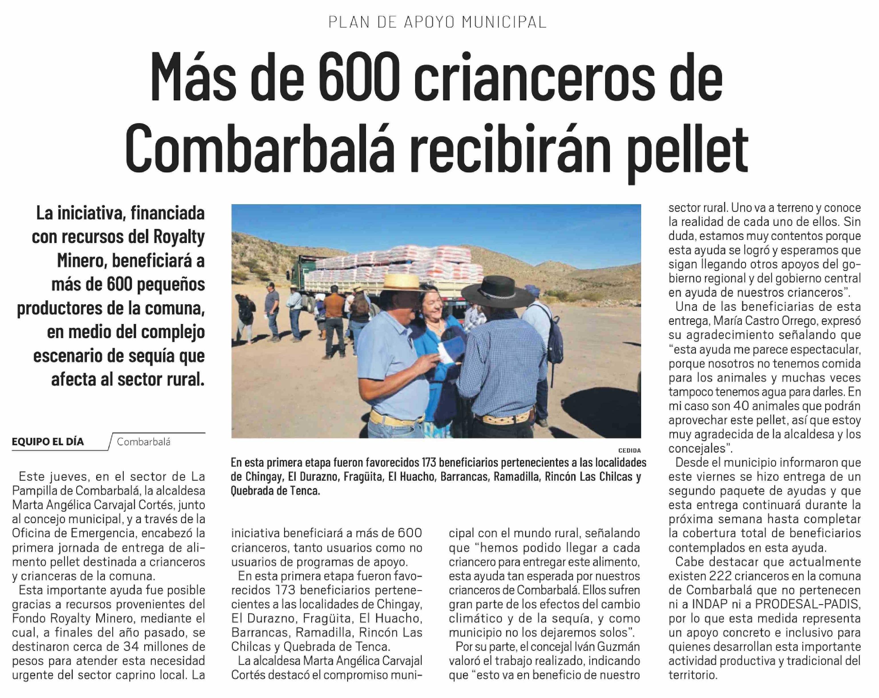 Más de 600 crianceros de Combarbalá recibirán pellet 19-04-2026 El Día |