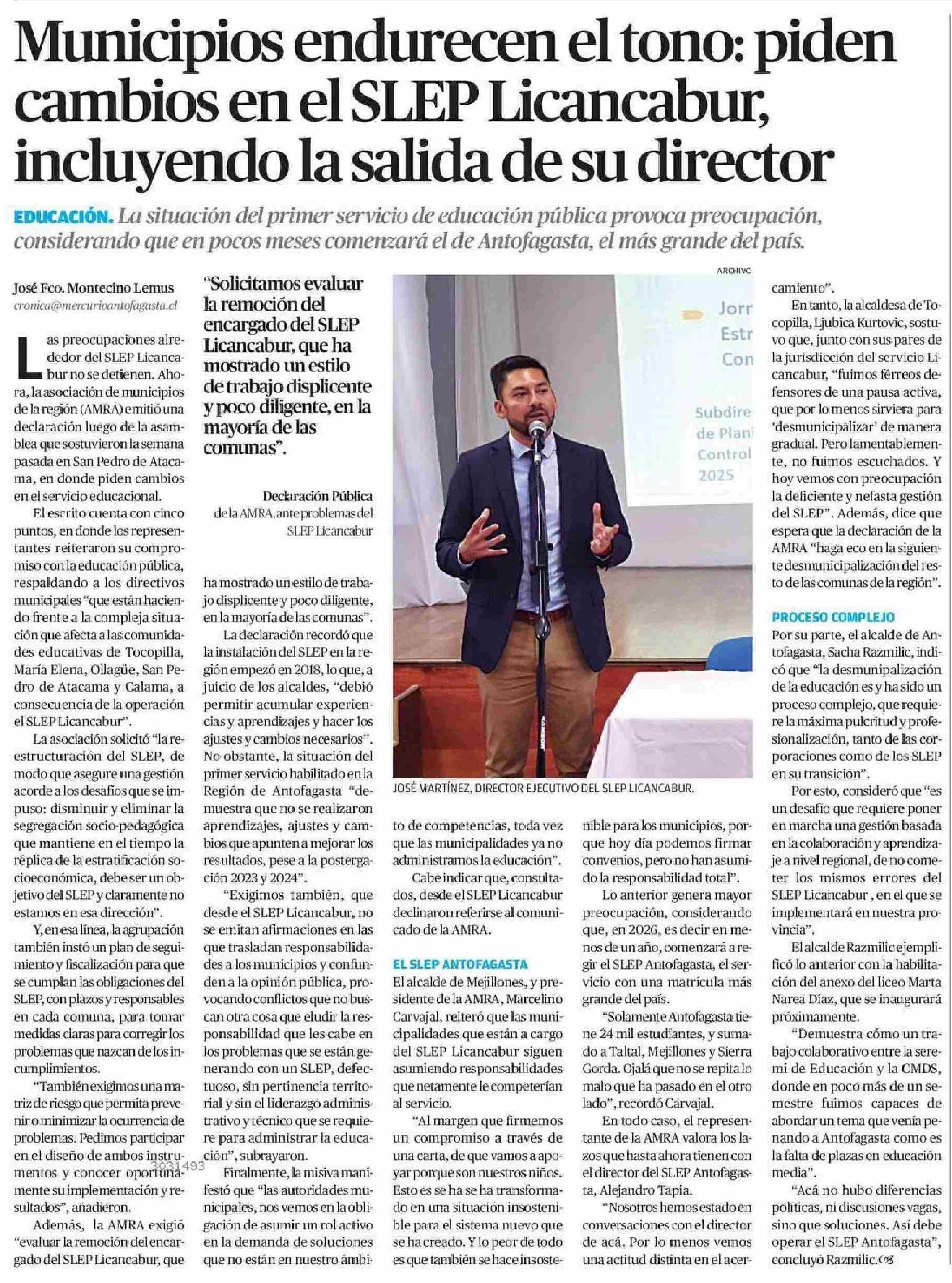 Municipios endurecen el tono: piden cambios en el SLEP Licancabur, incluyendo la salida de su director 24-06-2025 El Mercurio de Antofagasta |