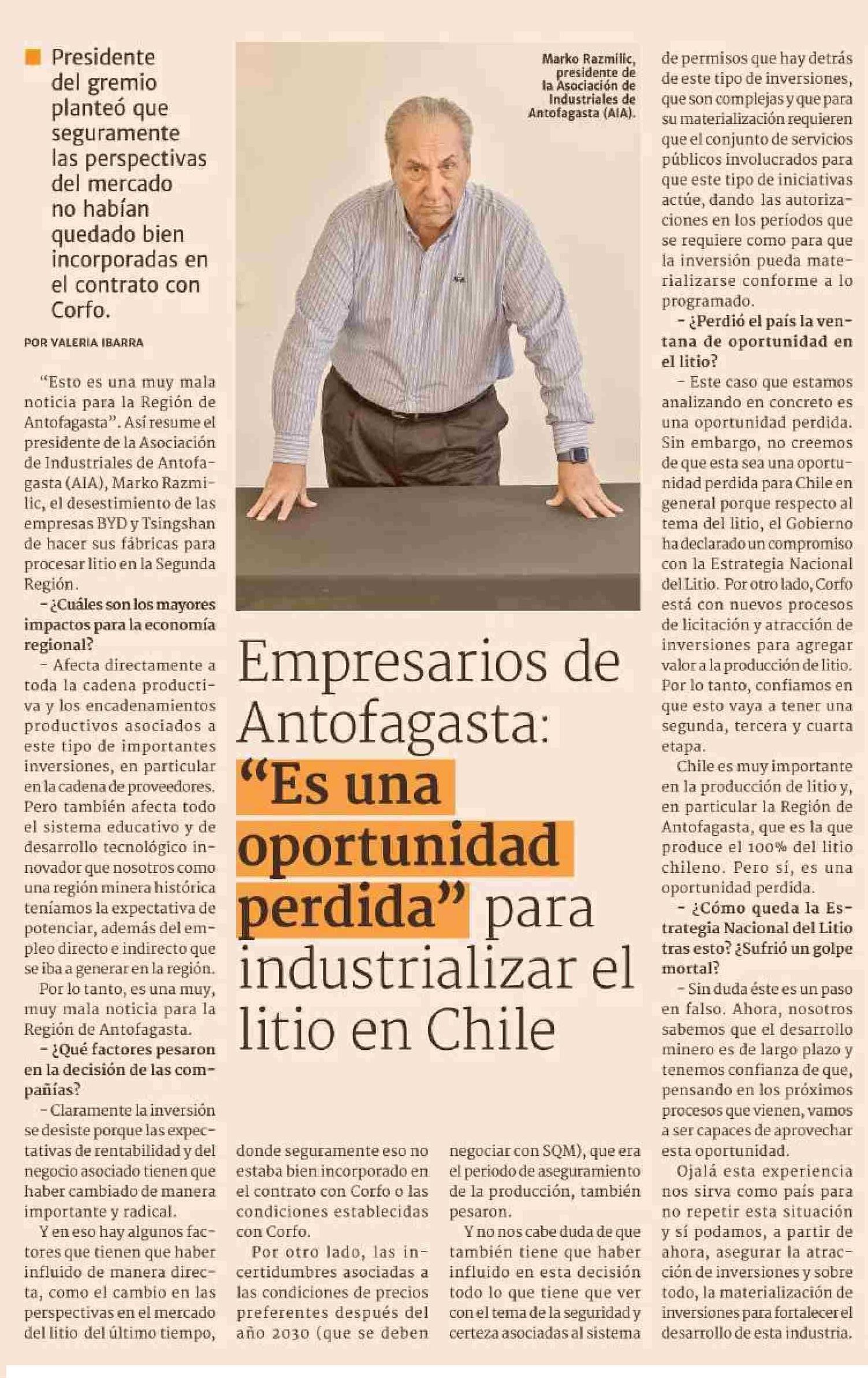 Título: Empresarios de Antofagasta: " Esuna oportunidad perdida” para industrializar el litio en Chile