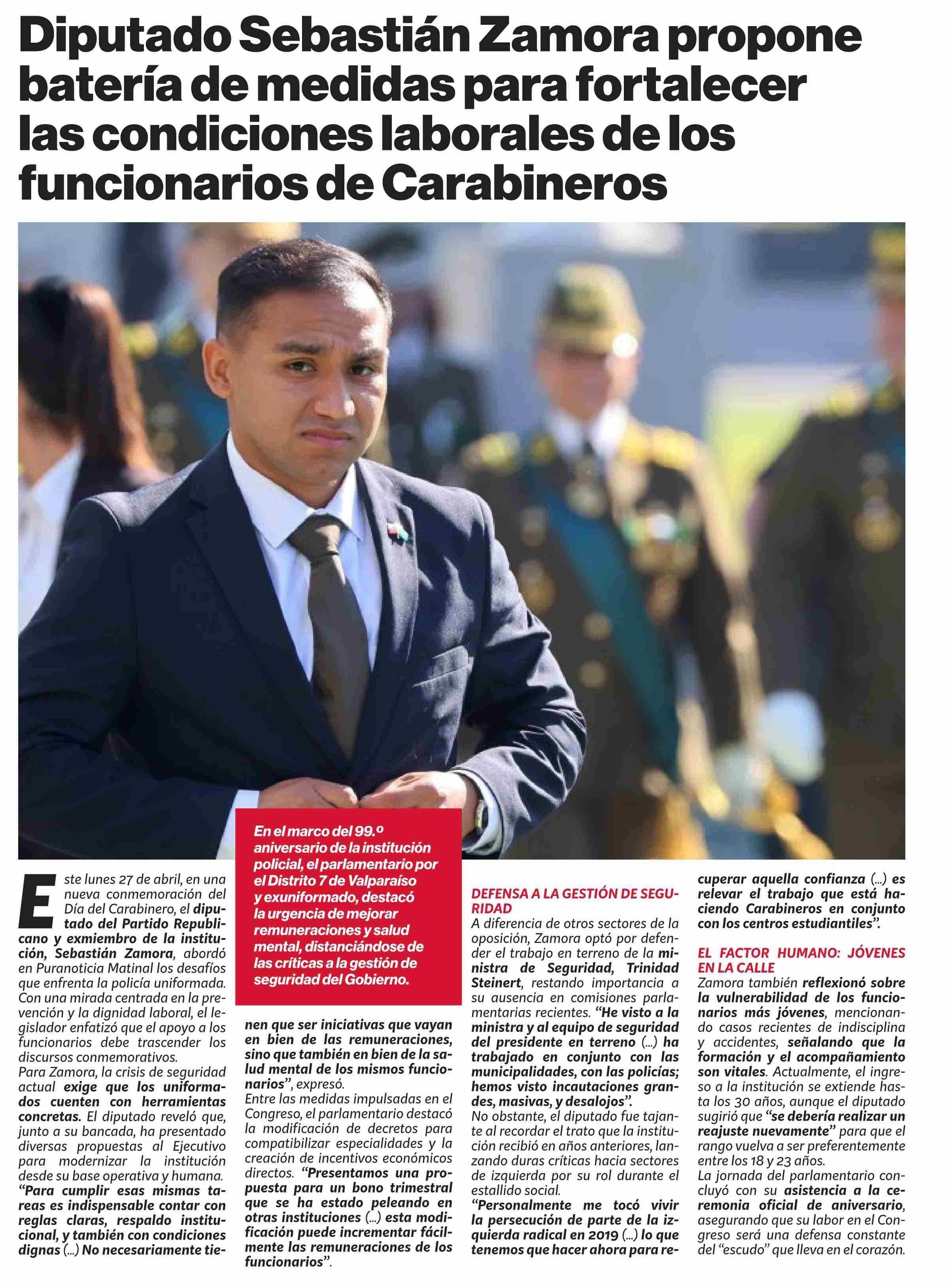 Diputado Sebastián Zamora propone batería de medidas para fortalecer las condiciones laborales de los funcionarios de Carabineros 27-04-2026 Puranoticia.cl |