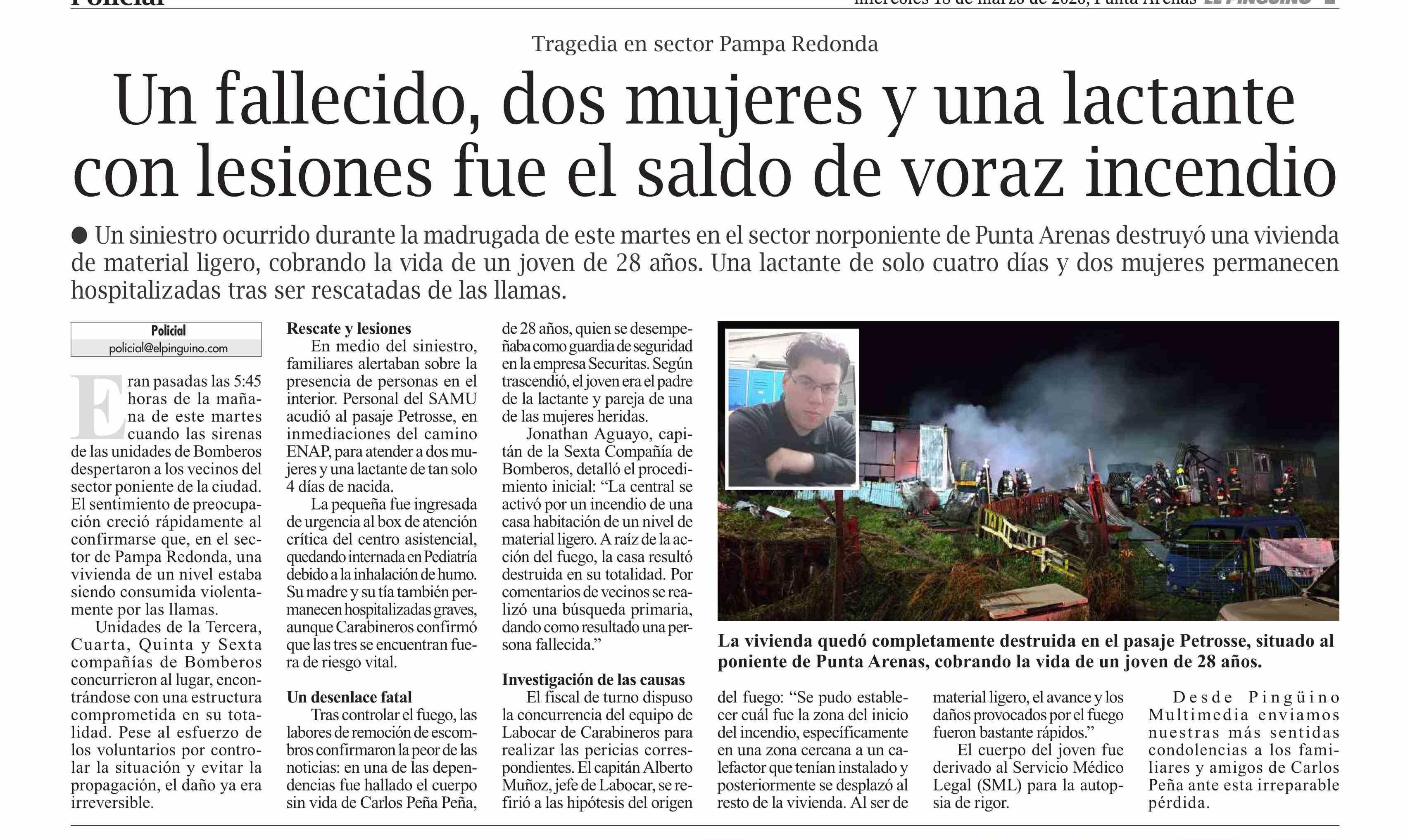 Un fallecido, dos mujeres una lactante con lesiones fue el saldo de voraz incendio 18-03-2026 El Pingüino |