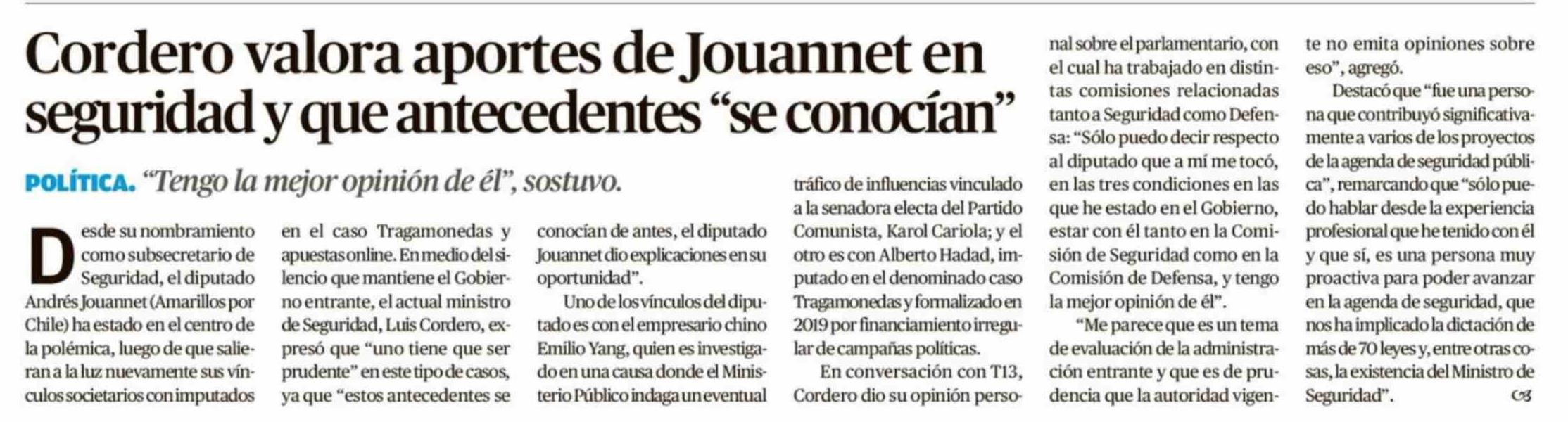 Cordero valora aportes de Jouannet en seguridad y que antecedentes "se conocían" 15-02-2026 El Mercurio de Valparaíso |