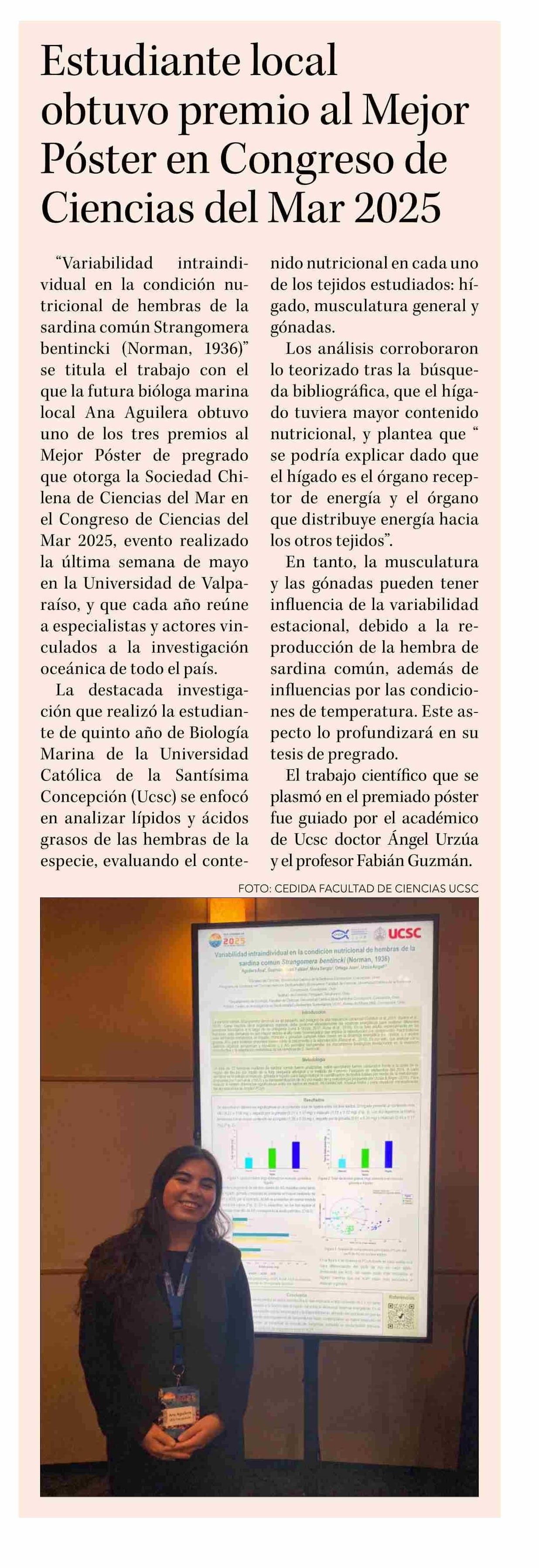 Estudiante local obtuvo premio al Mejor Póster en Congreso de Ciencias del Mar 2025 21-06-2025 Diario Concepción |
