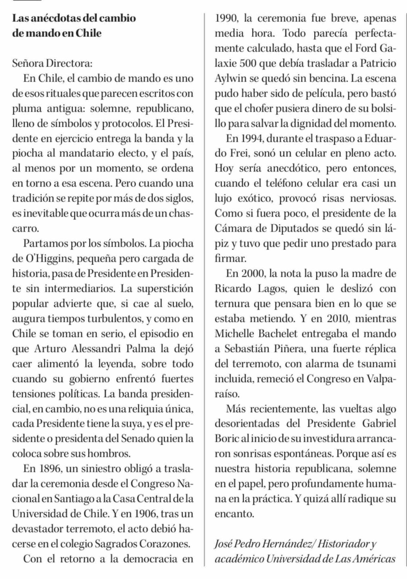 Cartas: Las anécdotas del cambio de mando en Chile 07-03-2026 Diario Concepción |