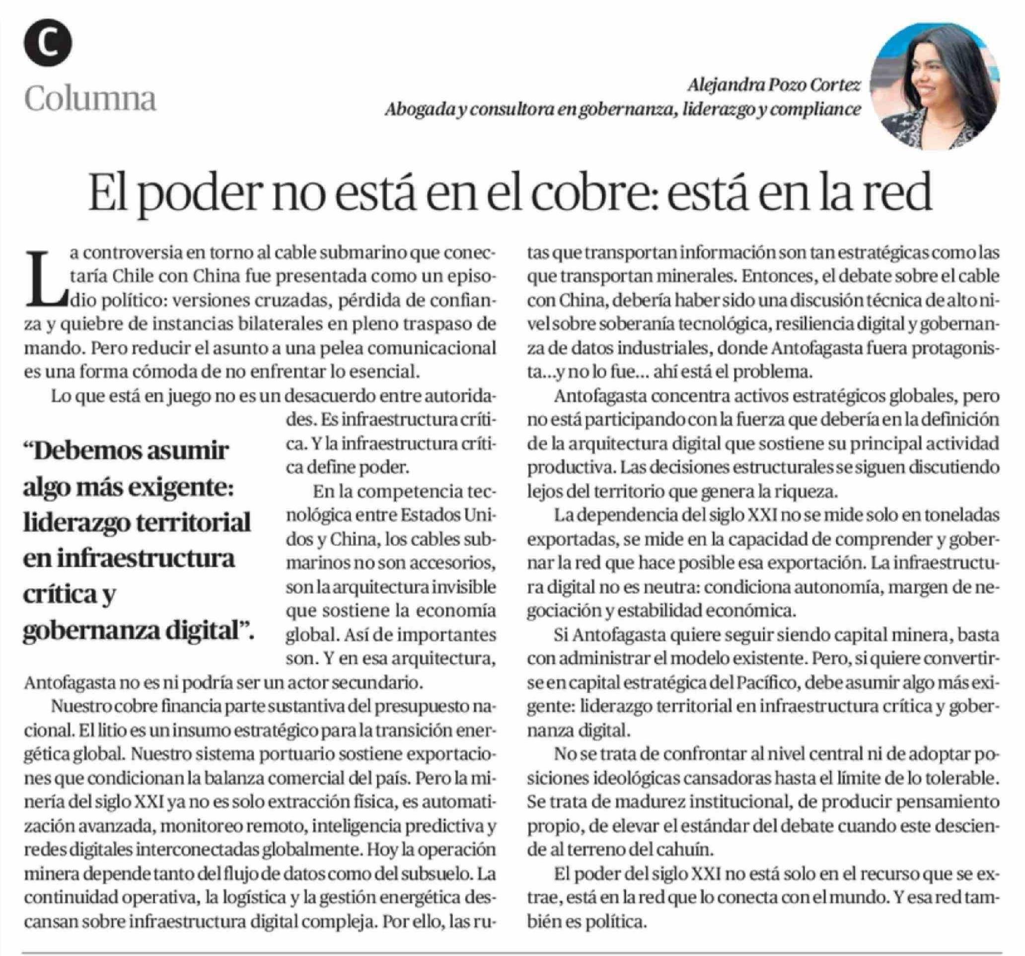 Columnas de Opinión: El poder no está en el cobre: está en la red 05-03-2026 El Mercurio de Antofagasta |