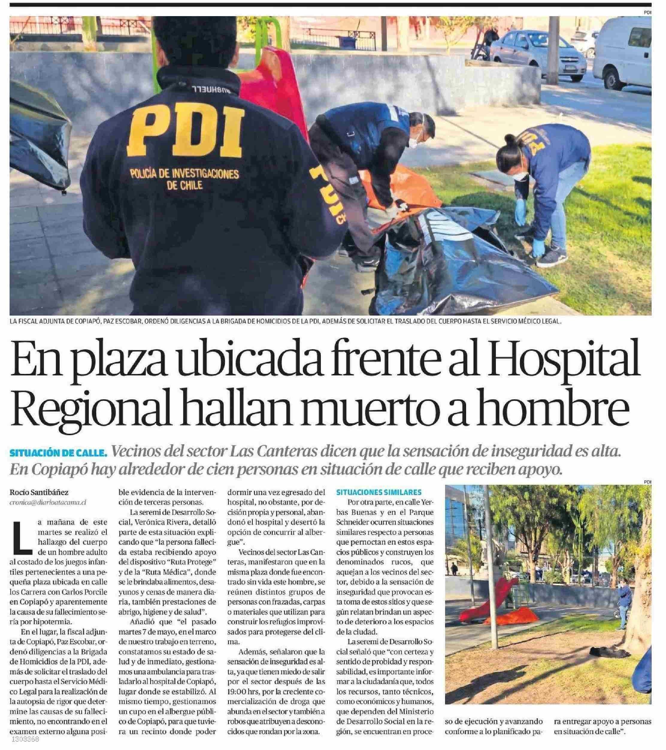 En plaza ubicada ente al Hospital Regjonal hallan muerto a hombre 21-05-2025 El Diario de Atacama |