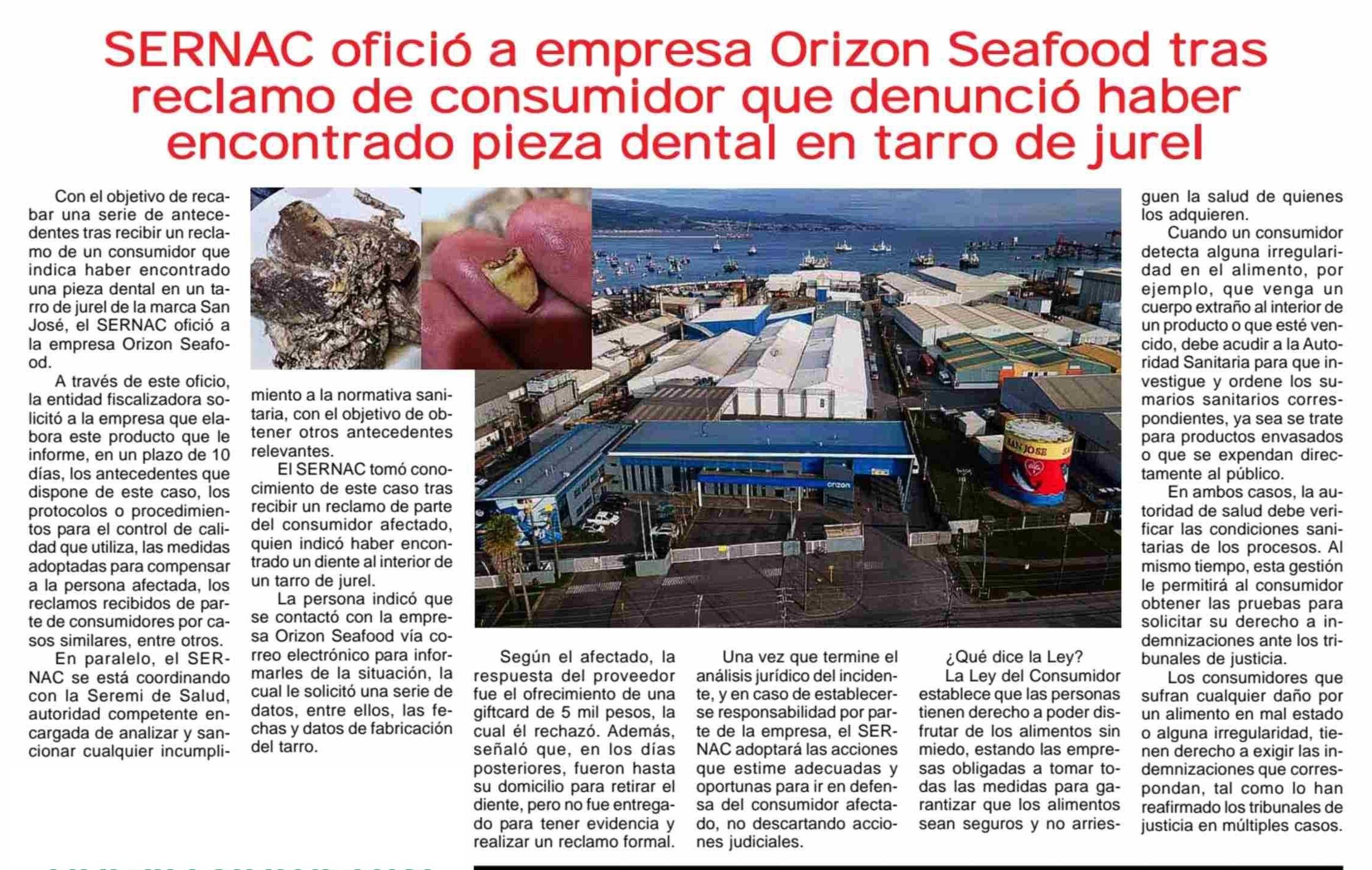 SERNAC ofició a empresa Orizon Seafood tras reclamo de consumidor que denunció haber encontrado pieza dental en tarro de jurel 06-06-2025 Maule Hoy |