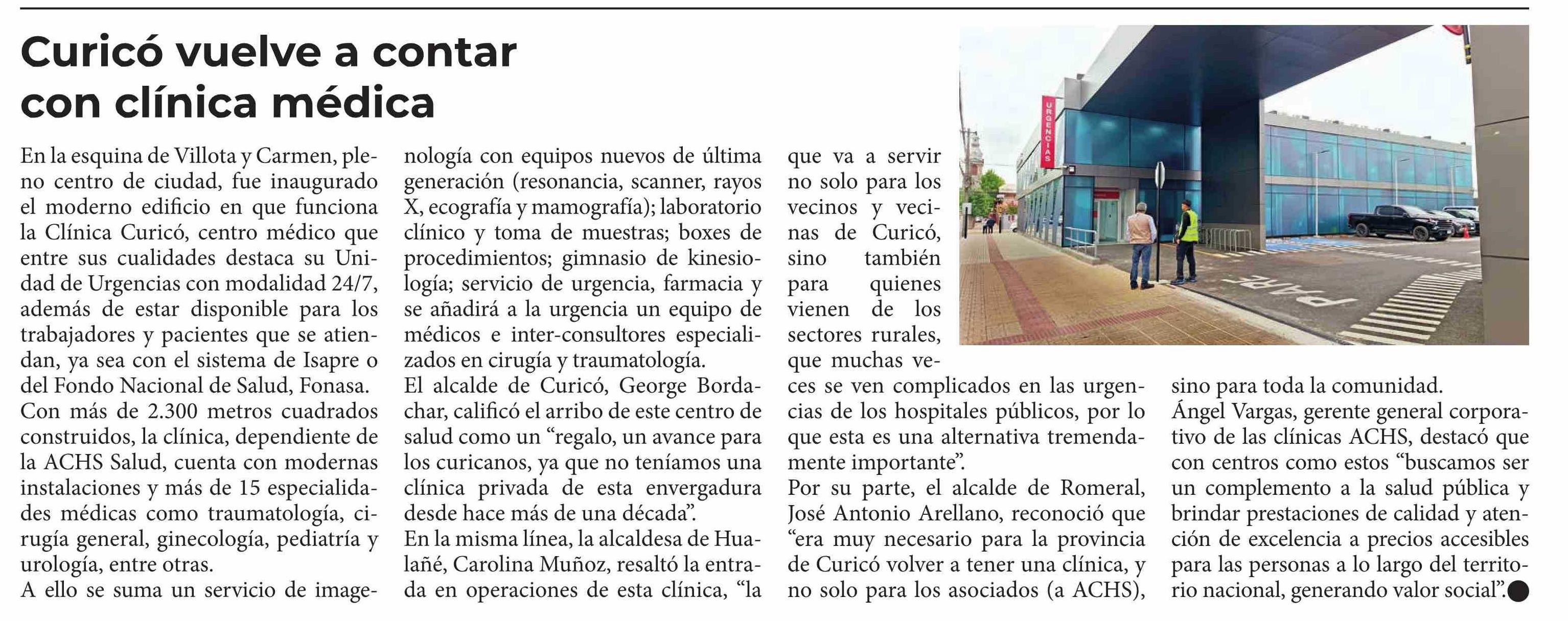 | Título: | Curicó vuelve a contar con clínica médica |