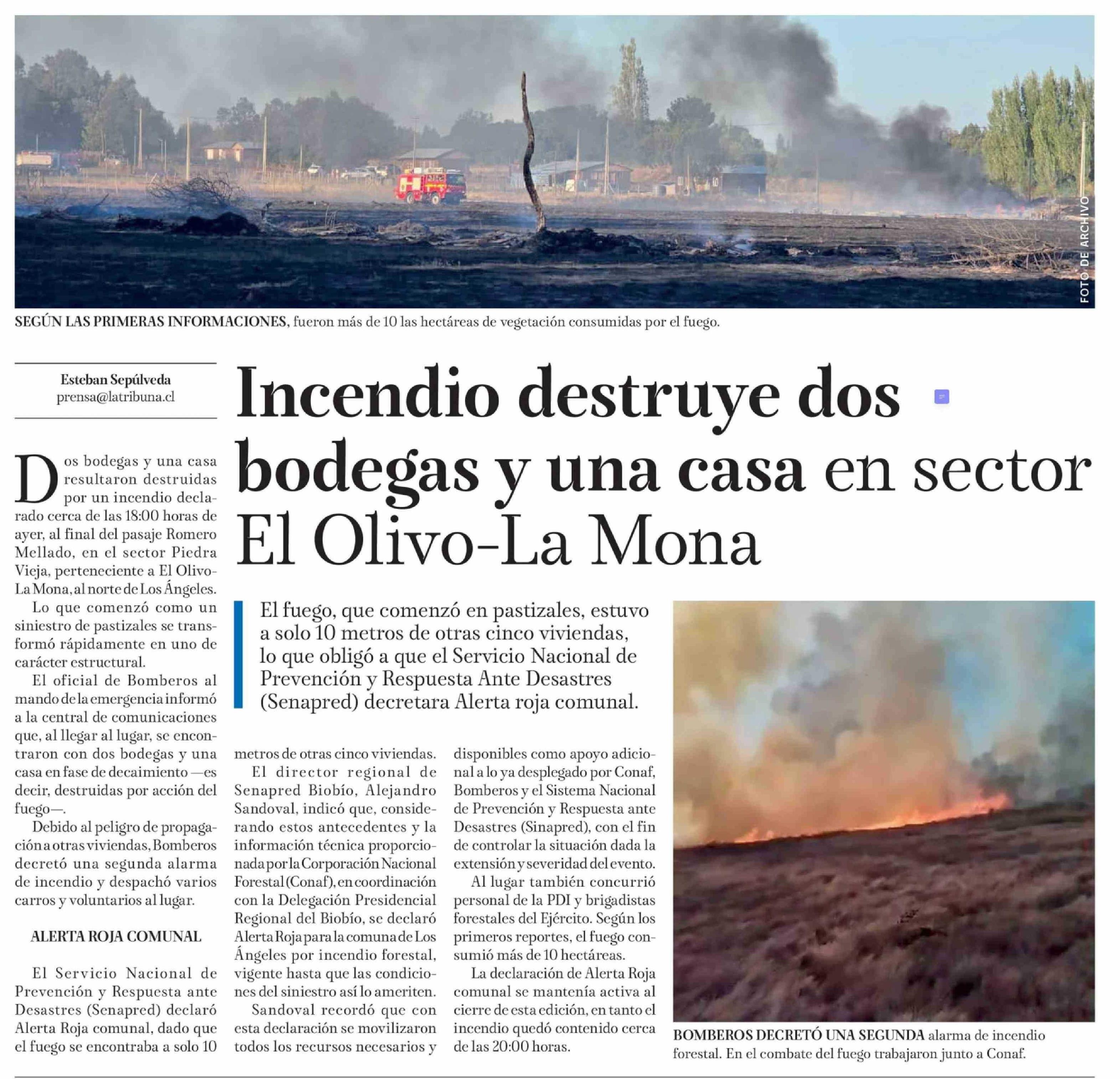 Incendio destruye dos bodegas y una casa en sector El Olivo-La Mona 25-02-2026 La Tribuna |