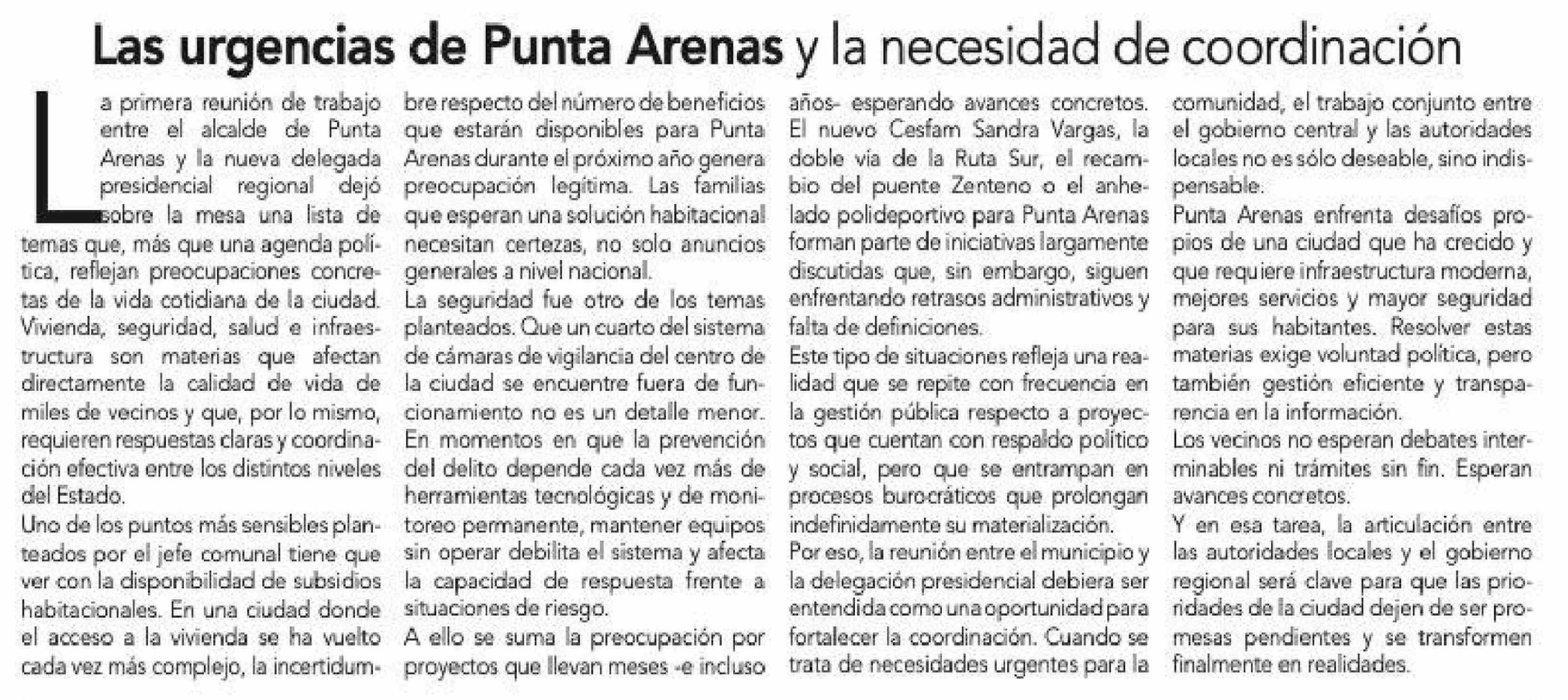 Las urgencias de Punta Arenas y la necesidad de coordinación 21-03-2026 La Prensa Austral |