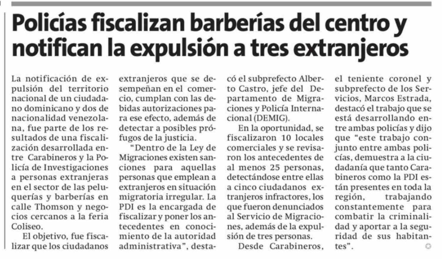 Título: Policías fiscalizan barberías del centro y notifican la expulsión a tres extranjeros