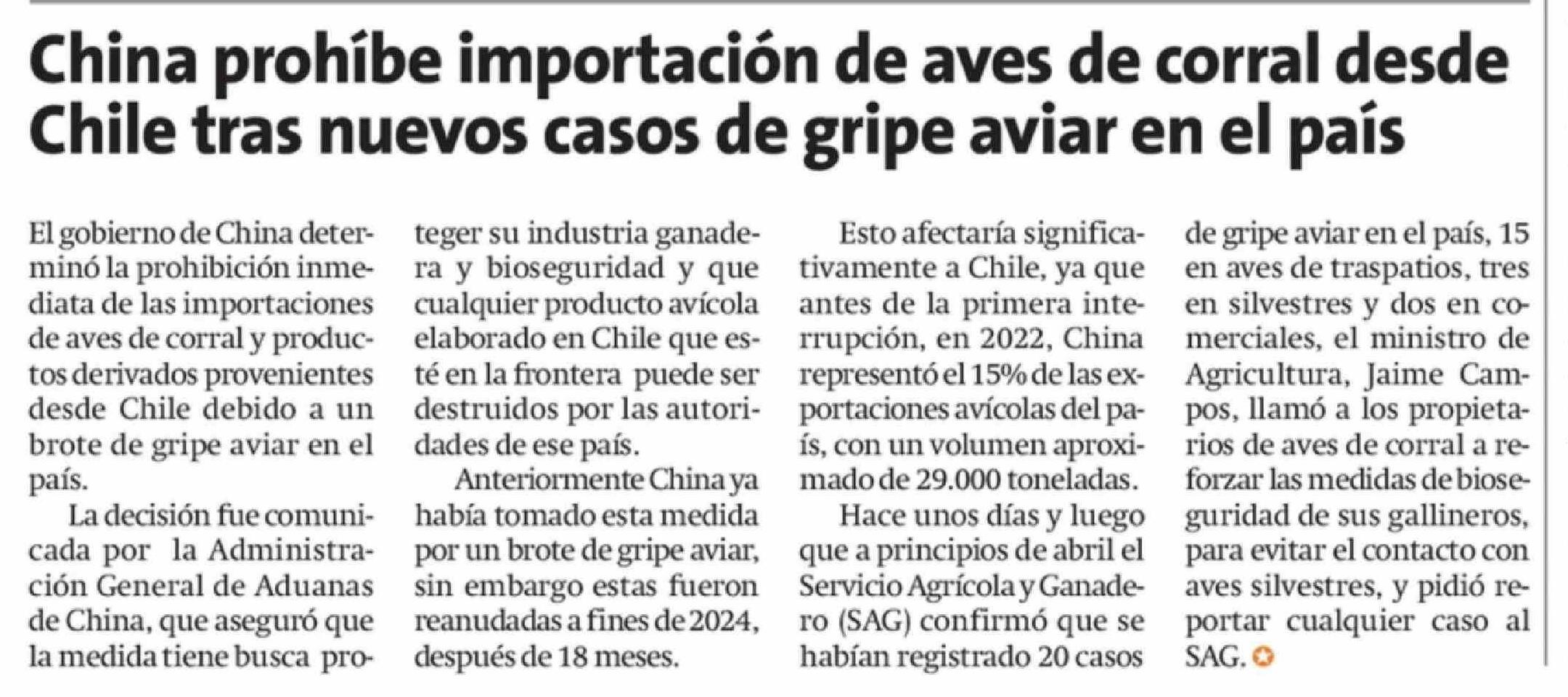 China prohíbe importación de aves de corral desde Chile tras nuevos casos de gripe aviar en el país 24-04-2026 La Estrella de Antofagasta |