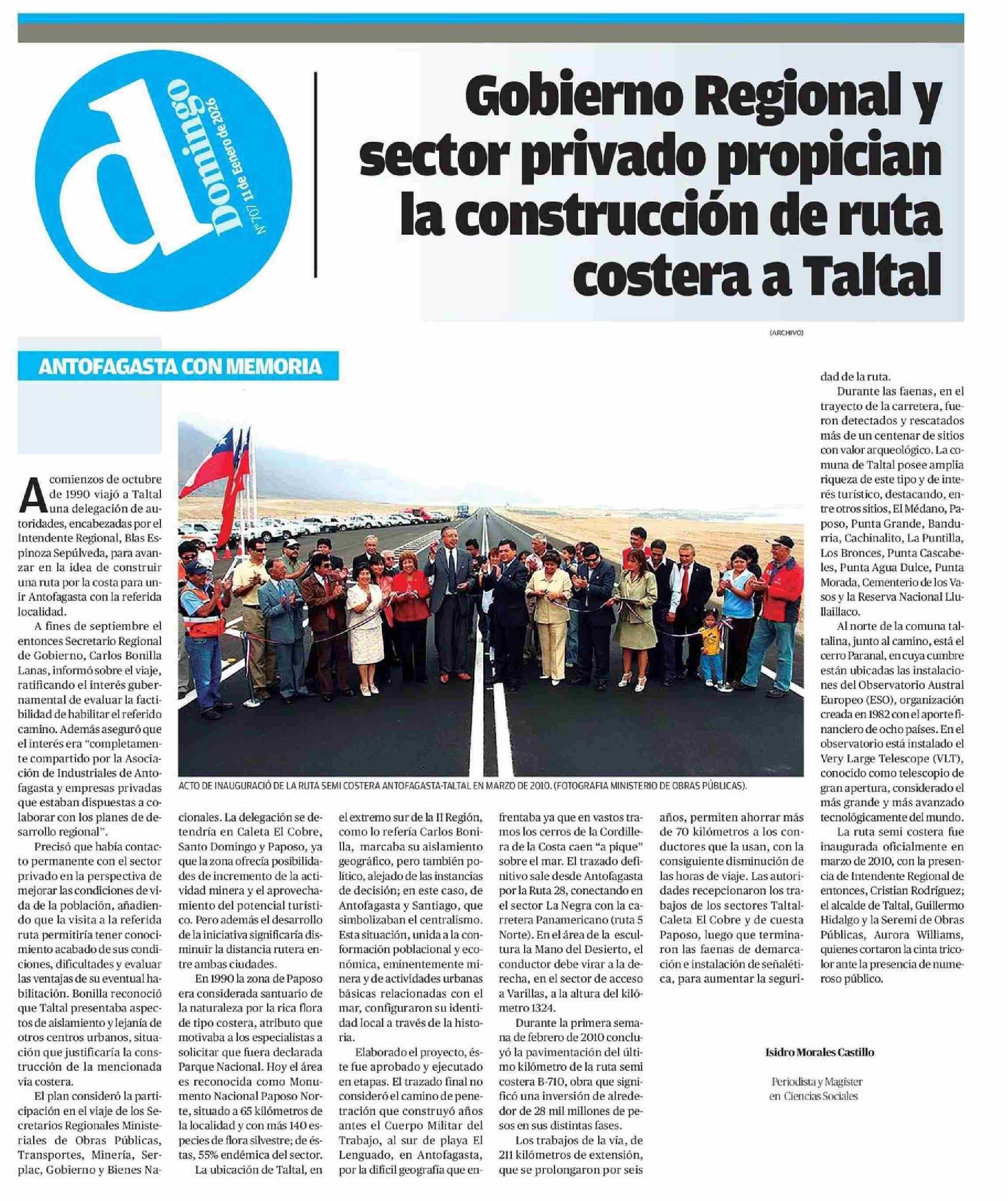 Gobierno Regional y sector privado propician la construcción de ruta costera a Taltal 11-01-2026 El Mercurio de Calama |