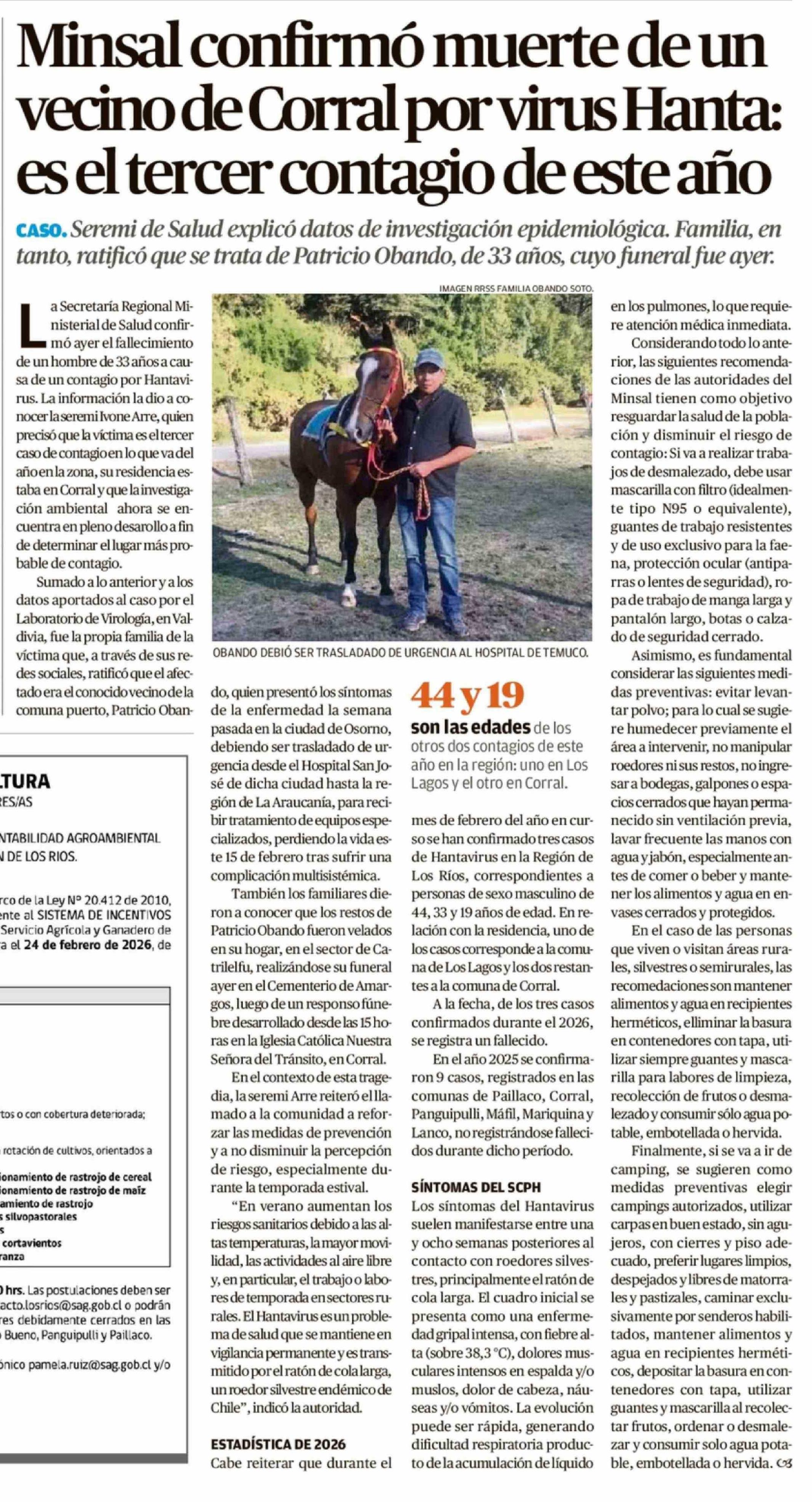 Minsal confirmó muerte de un vecino de Corral por virus Hanta: es el tercer contagio de este año 17-02-2026 Diario Austral Región de Los Ríos |