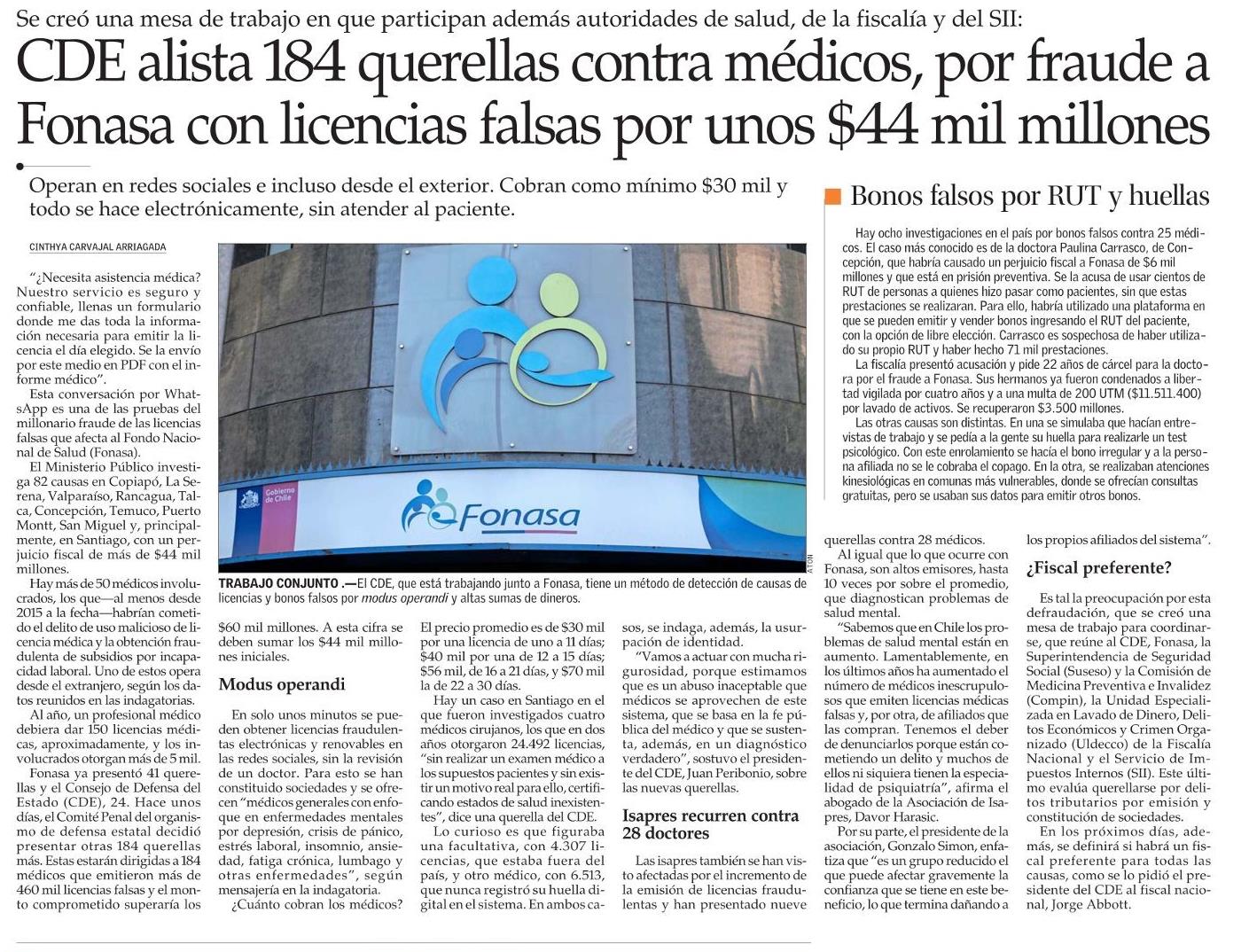 CDE alista 184 querellas contra médicos, por fraude a Fonasa con licencias falsas por unos $44 mil millones 05-06-2022 El Mercurio |