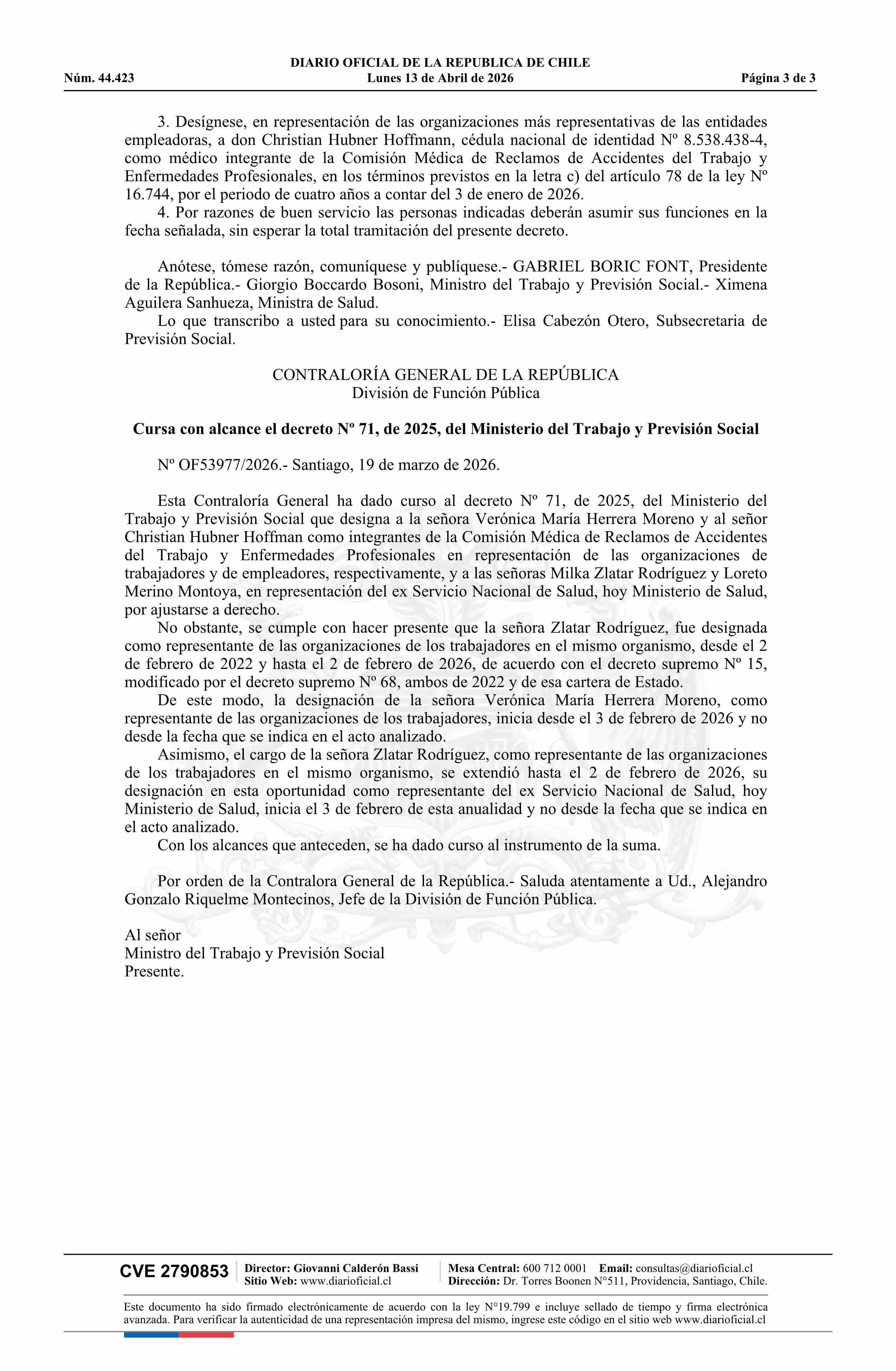 Decreto número 71, de 2025.- Designa integrantes de la Comisión Médica de Reclamos de Accidentes del Trabajo y Enfermedades Profesionales 13-04-2026 Diario Oficial Edición Electrónica |