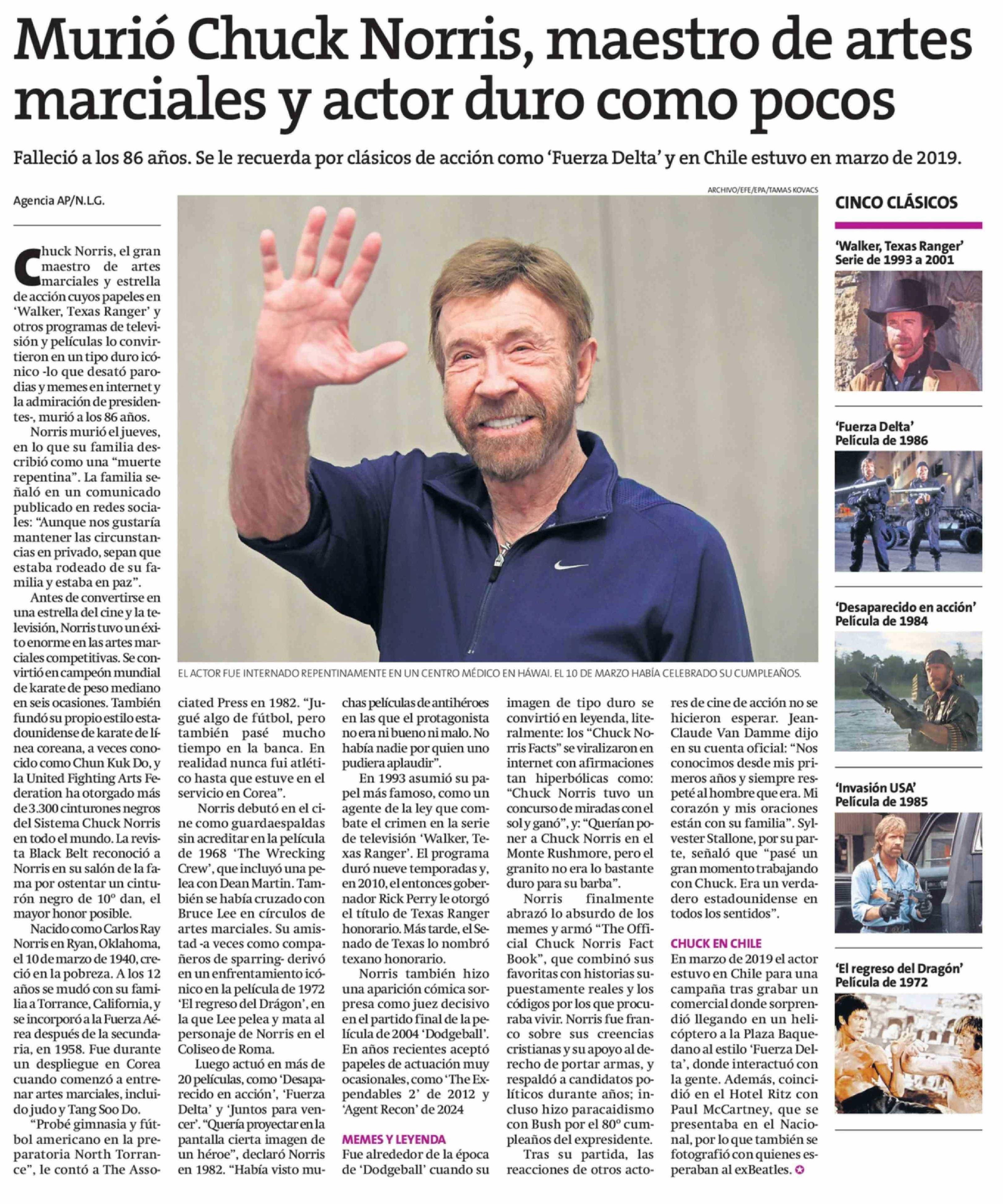 Murió Chuck Norris, maestro de artes marciales y actor duro como pocos 21-03-2026 La Estrella de Concepción |