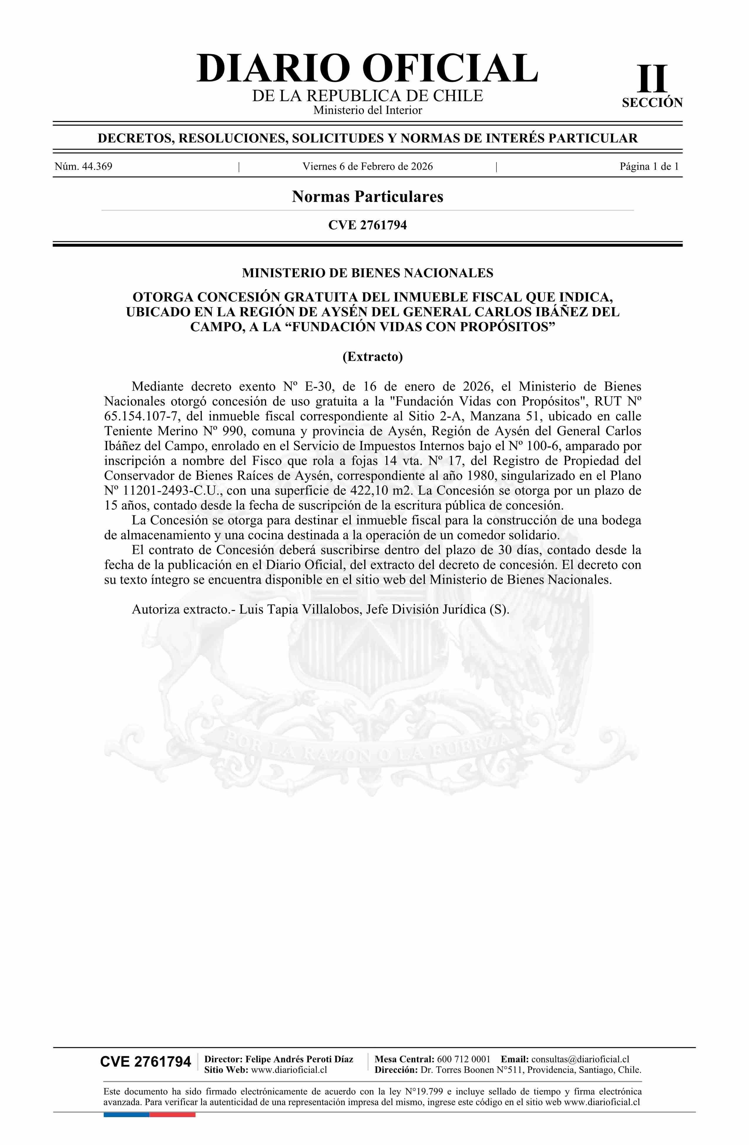 Extracto de decreto exento número E-30, de 2026.- Otorga concesión gratuita del inmueble fiscal que indica, ubicado en la Región de Aysén del General Carlos Ibáñez del Campo, a la Fundación Vidas con Propósitos