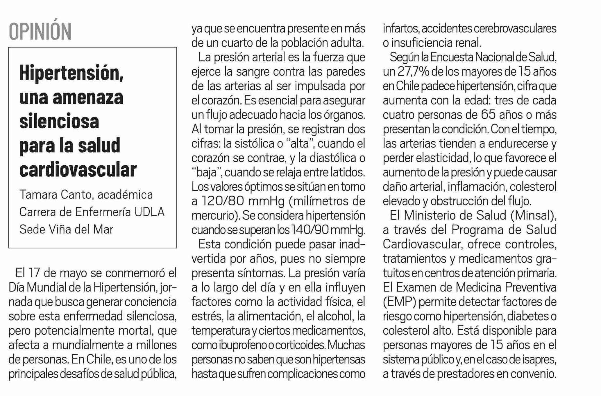 Título: COLUMNAS DE OPINIÓN: Hipertensión, una amenaza silenciosa para la salud cardiovascular