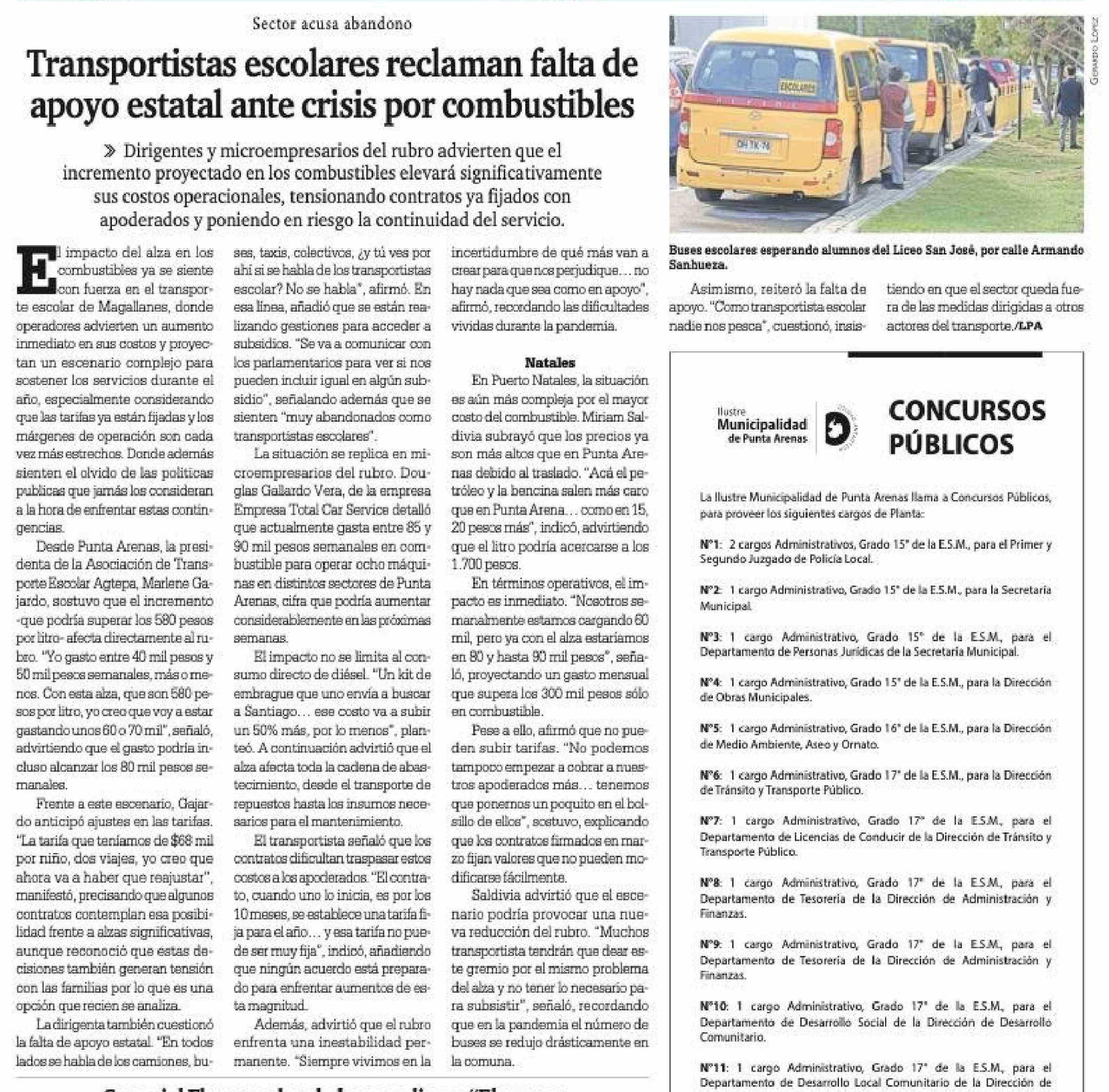 Transportistas escolares reclaman falta de apoyo estatal ante crisis por combustibles 26-03-2026 La Prensa Austral |