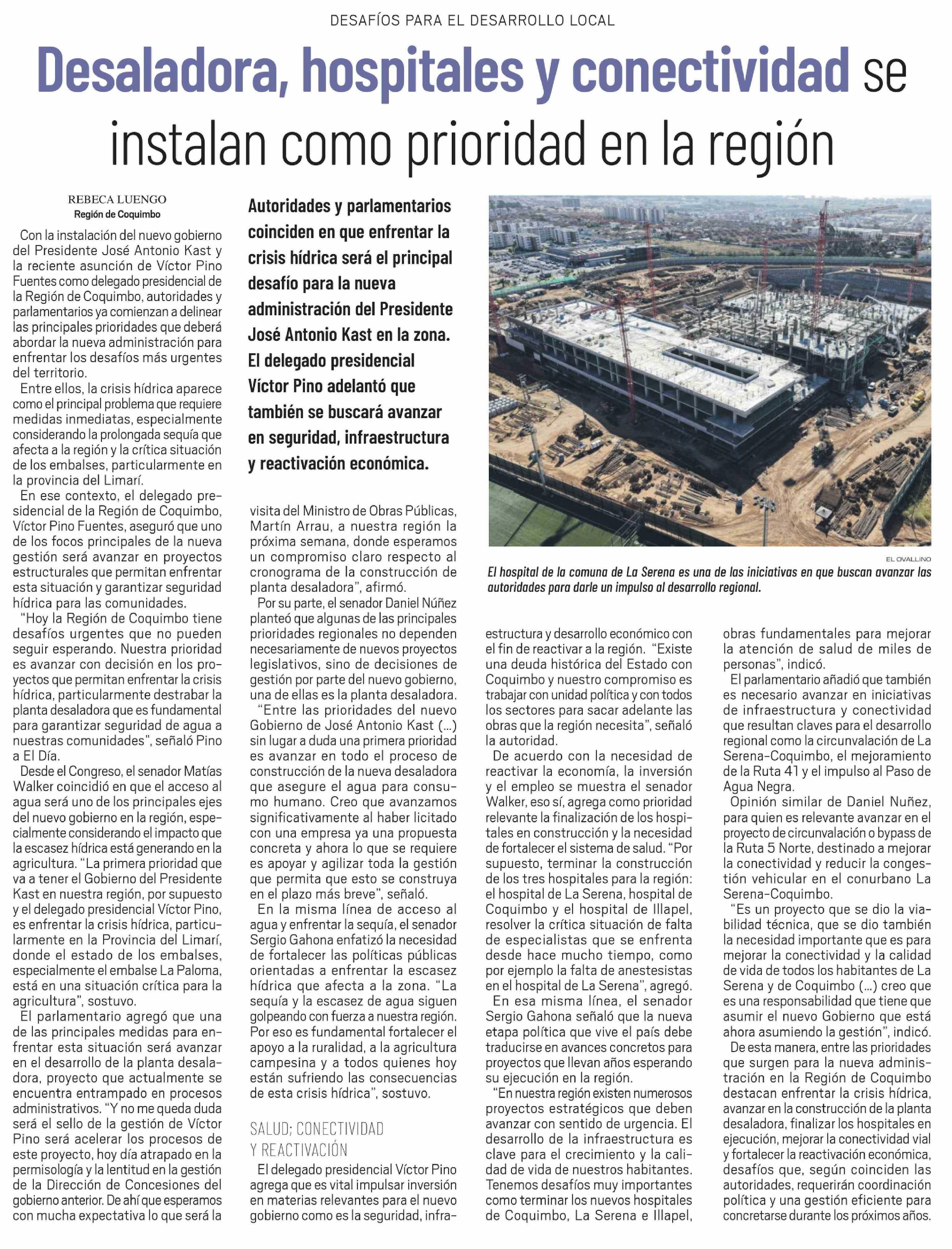 Título: Desaladora, hospitales y conectividad se instalan como prioridad en la región