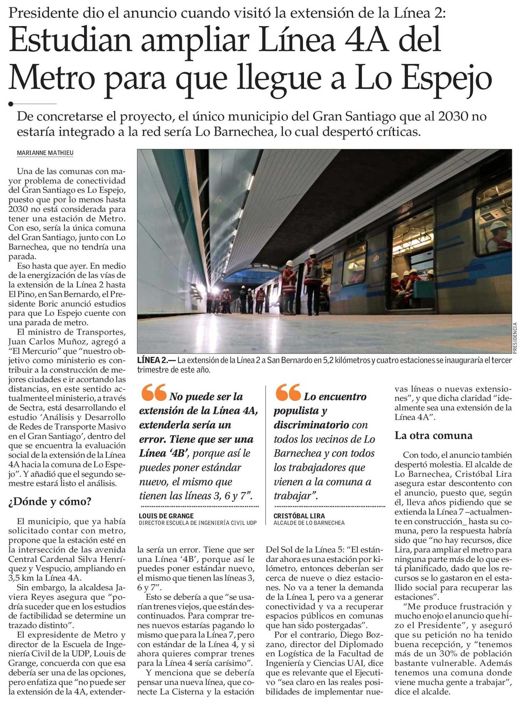 Título: Estudian ampliar Línea 4A del Metro para que llegue a Lo Espejo