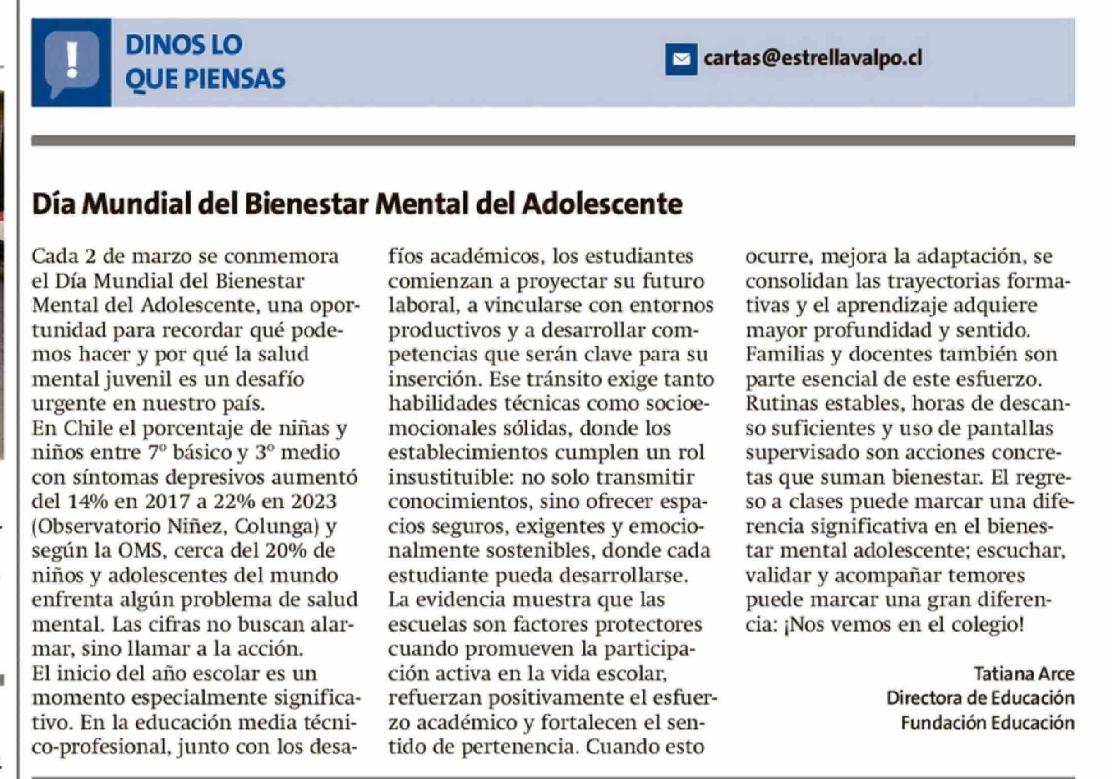 Columnas de Opinión: Día Mundial del Bienestar Mental del Adolescente 27-02-2026 La Estrella de Valparaíso |