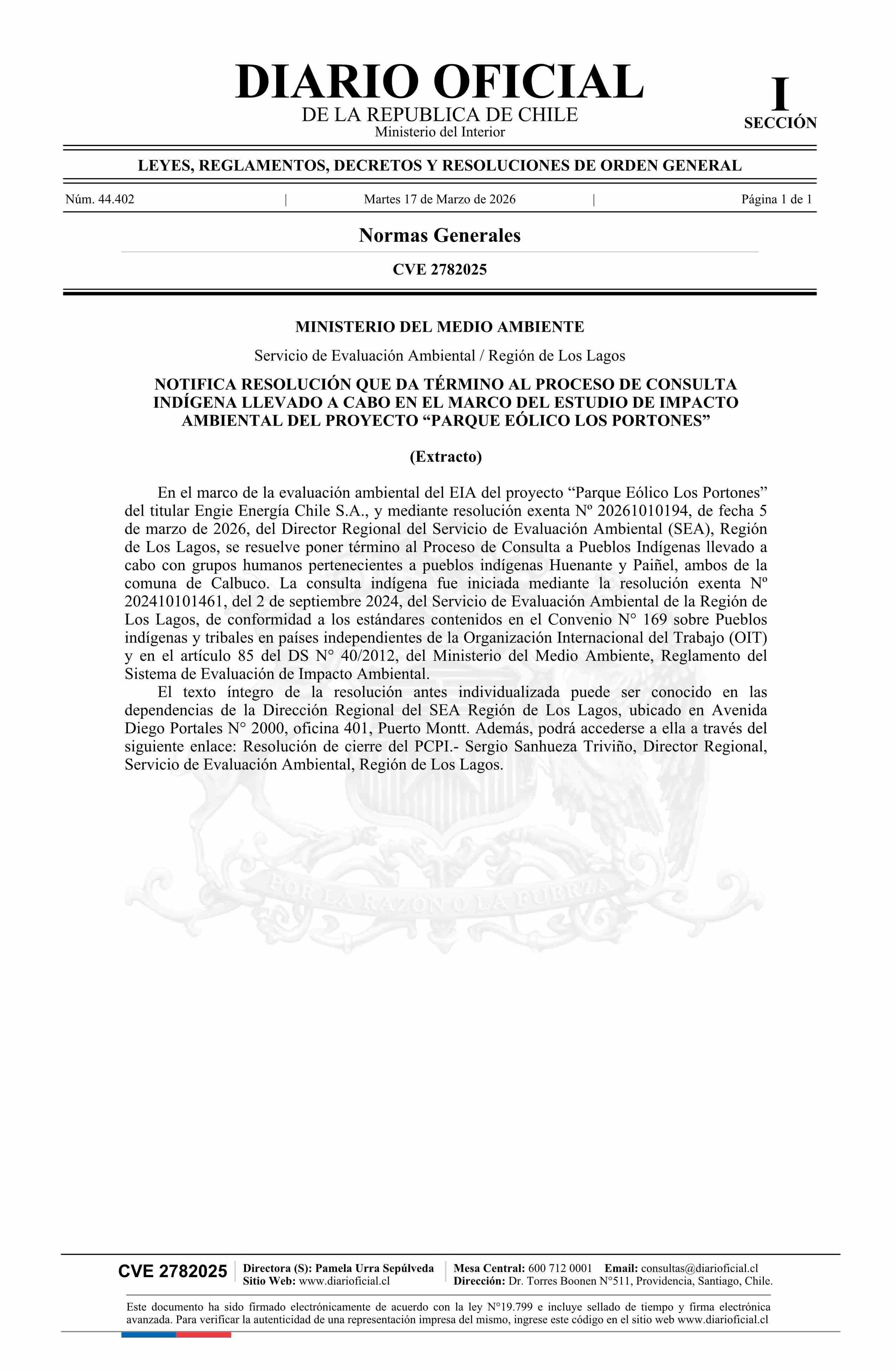 Título: Extracto de resolución exenta número 20261010194, de 2026.- Da término al proceso de consulta indígena llevado a cabo en el marco del Estudio de Impacto Ambiental del proyecto Parque Eólico Los Portones