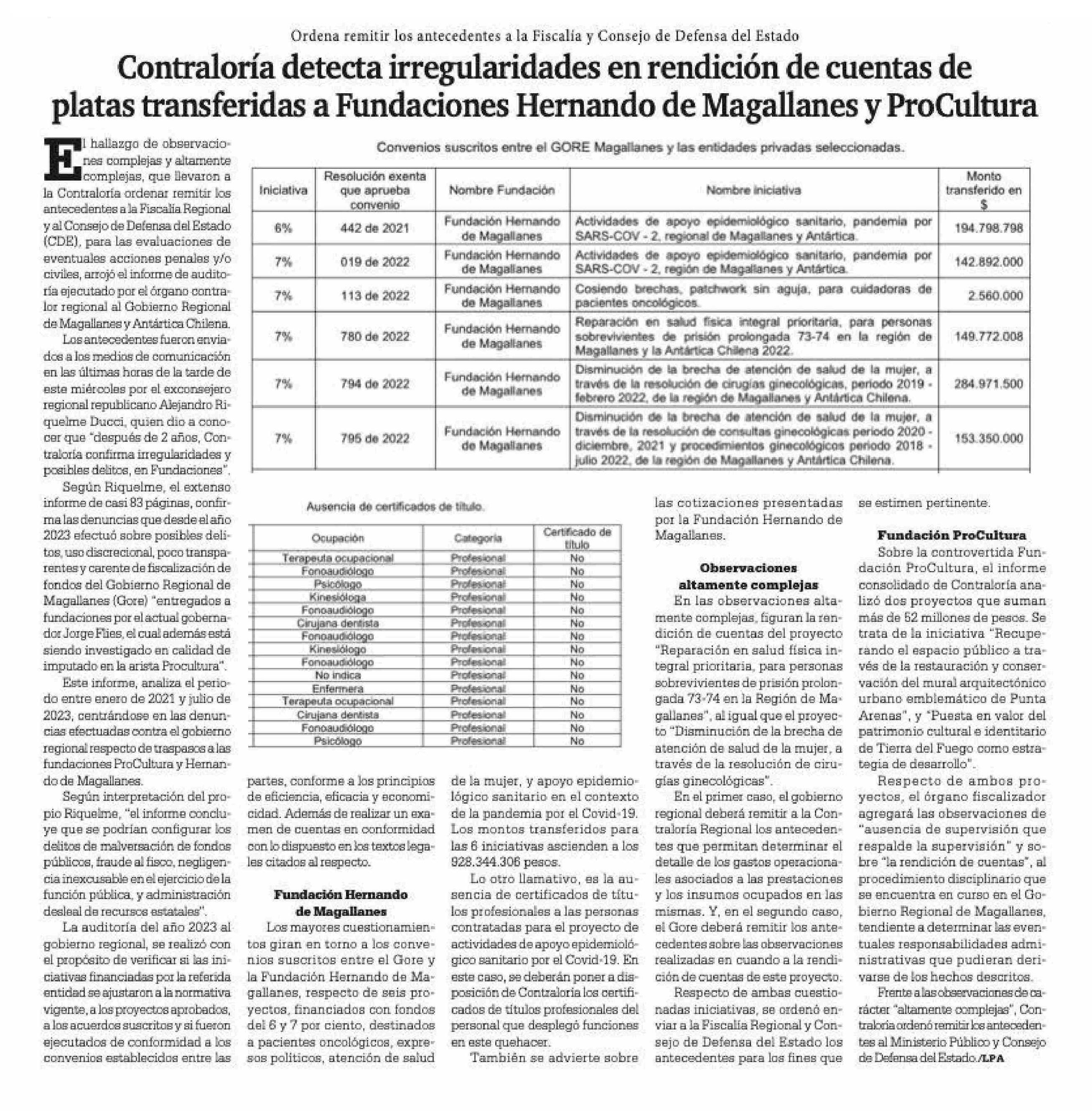 Contraloría detecta irregularidades en rendición de cuentas de platas transferidas a Fundaciones Hernando de Magallanes y ProCultura 29-05-2025 La Prensa Austral |