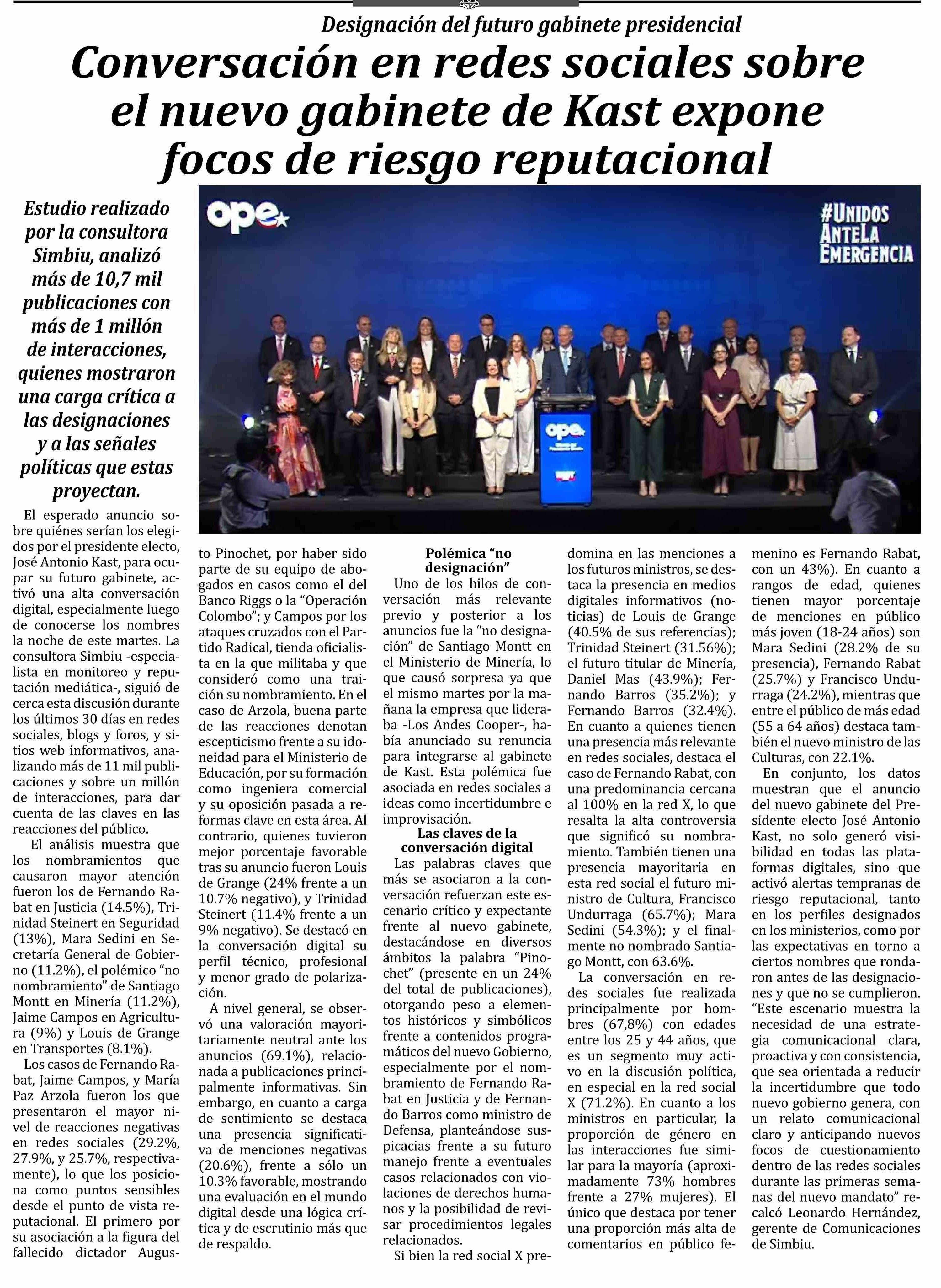 Conversación en redes sociales sobre el nuevo gabinete de Kast expone focos de riesgo reputacional 24-01-2026 Las Noticias |