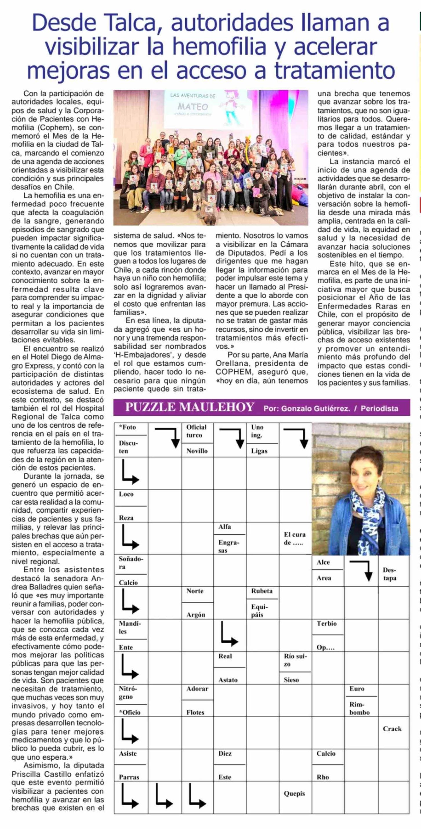 Desde Talca, autoridades llaman a visibilizar la hemofilia y acelerar mejoras en el acceso a tratamiento 24-04-2026 Maule Hoy |