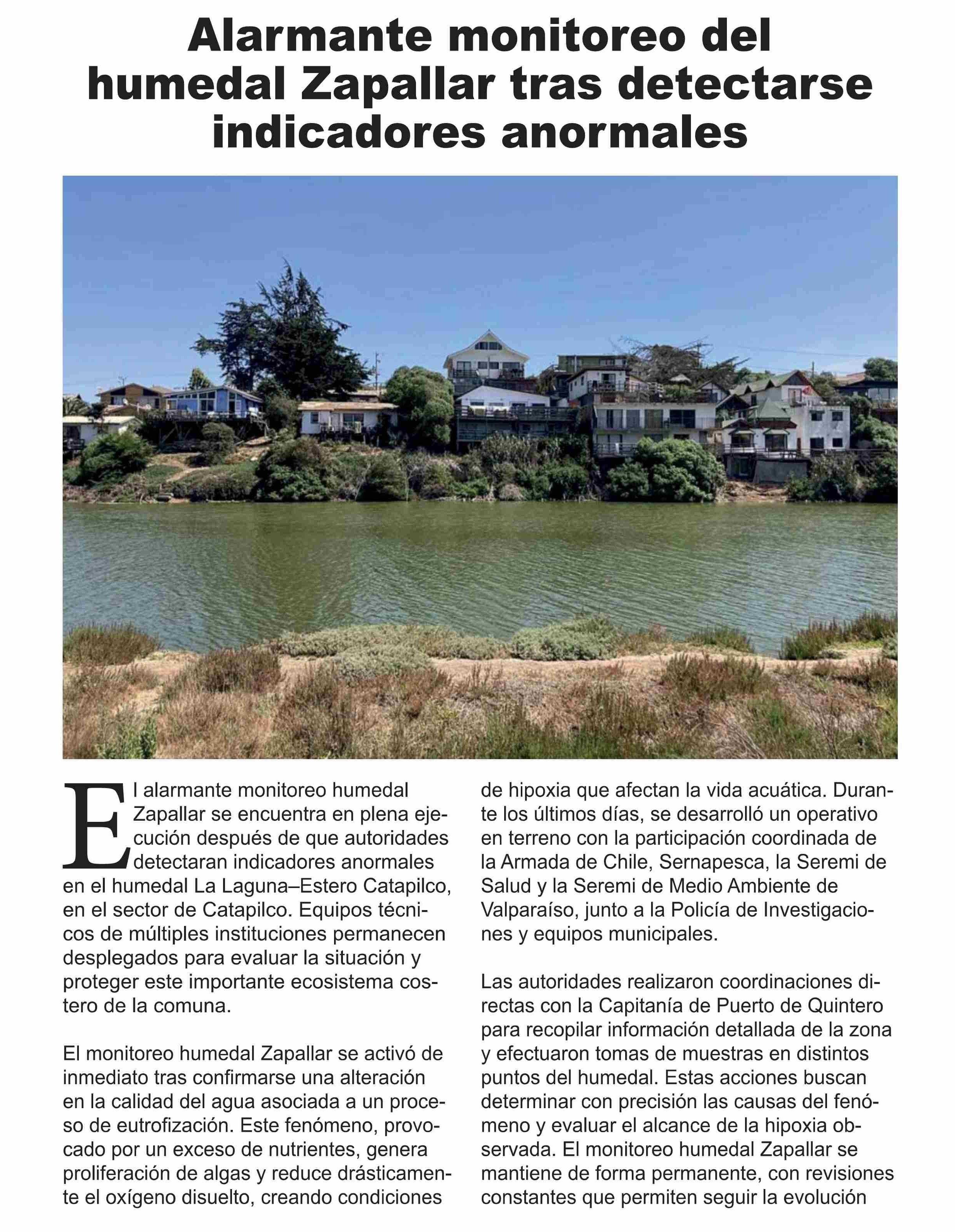 | Título: | Alarmante monitoreo del humedal Zapallar tras detectarse indicadores anormales |